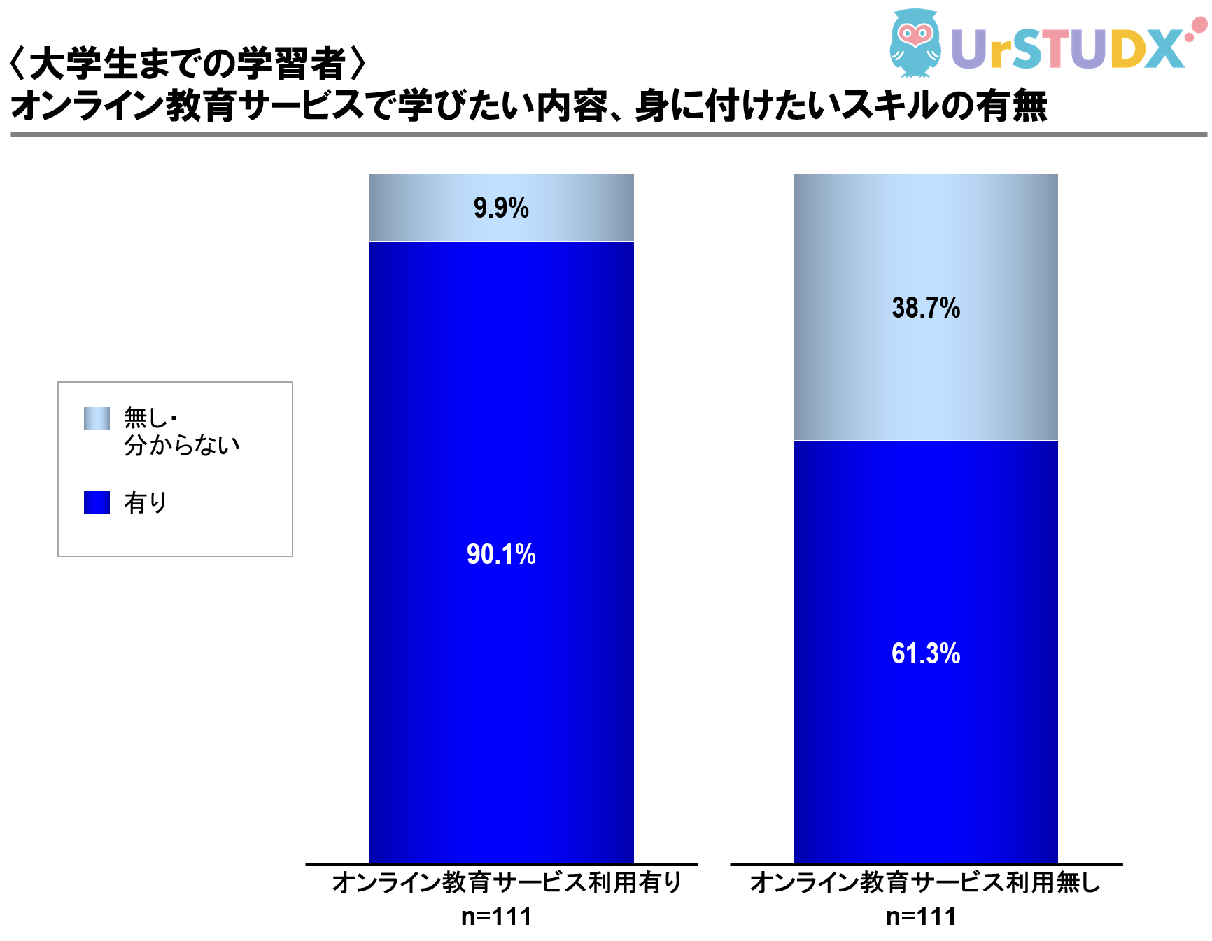 大学生まで学習者の内、オンライン教育サービスで学びたい、身に付けたいスキルが有ると回答した割合は、オンライン教育利用有り群で9割、オンライン教育利用無し群であっても6割を超えていました。