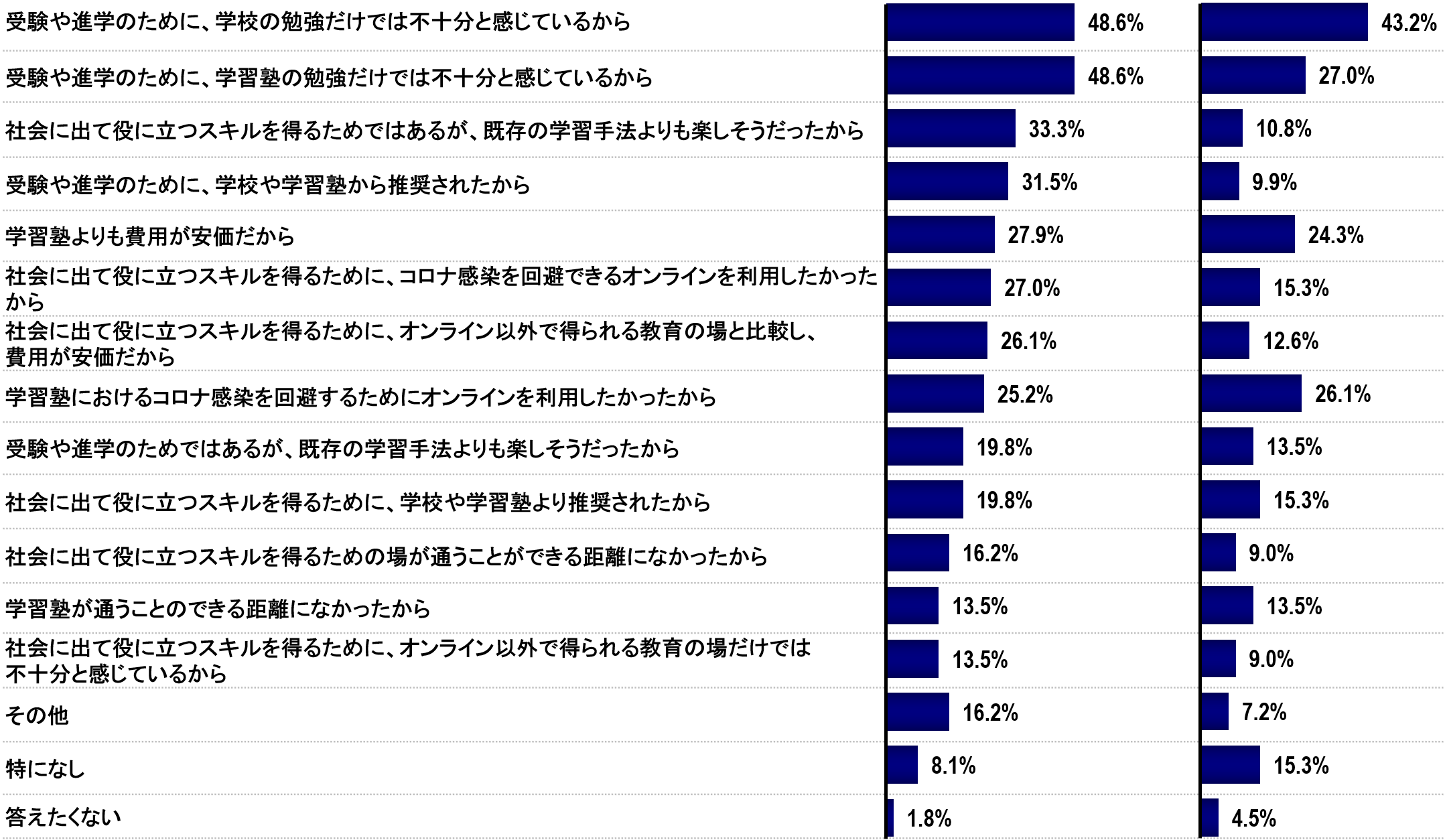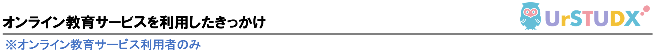 オンライン教育サービスについて、利用したきっかけを聞いたところ、セグメント問わず、「受験や進学のために既存の勉強では不十分と感じる」という回答が最も多い結果でした。