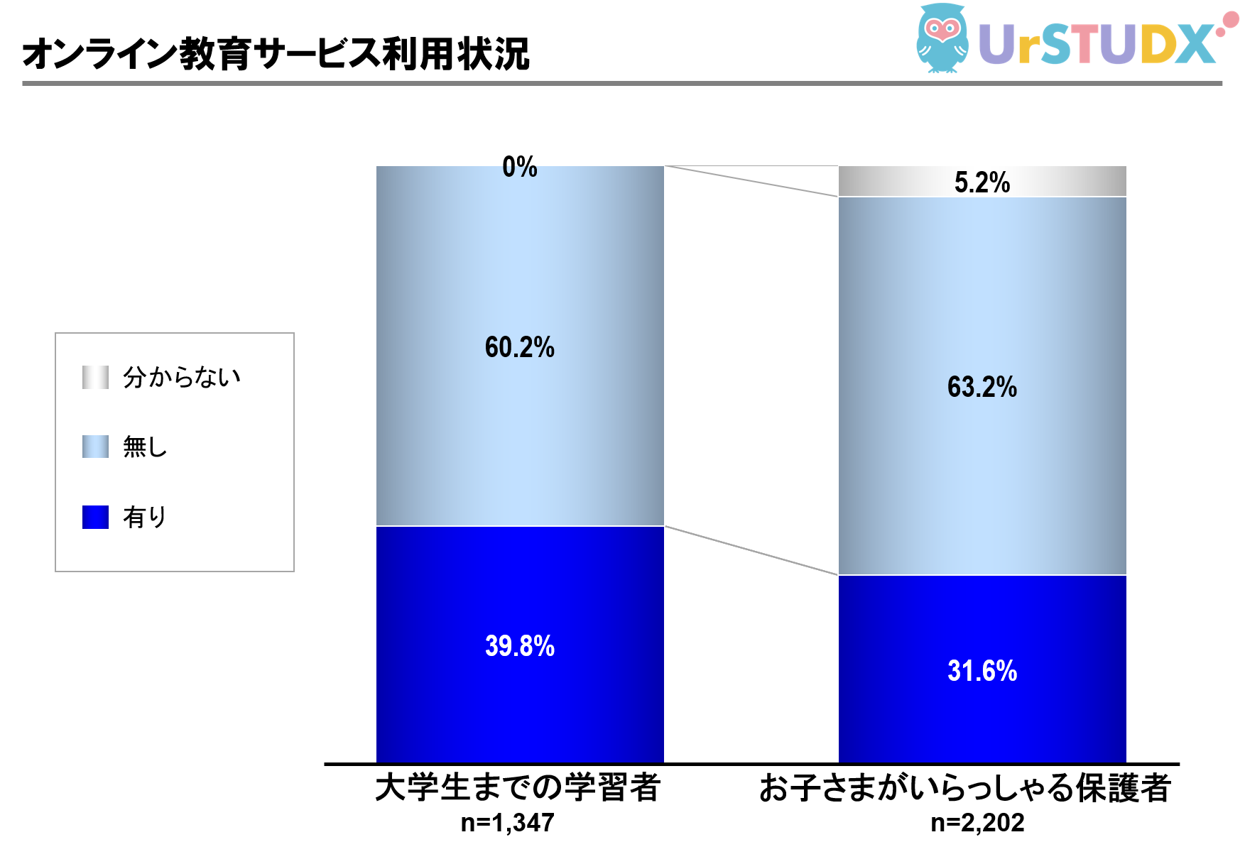 上記、①②のアンケート結果から「オンライン教育の利用状況」は、大学生までの学習者が約4割、お子さまがいらっしゃる保護者がお子さまに対し約3割であることが分かりました。