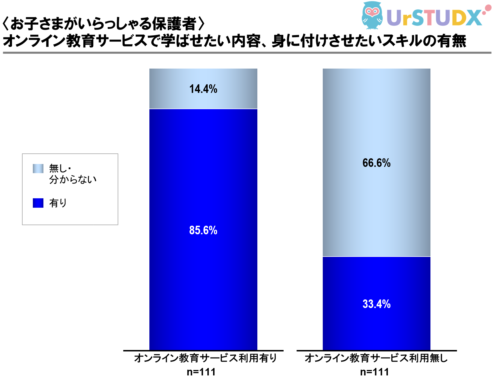 一方、お子さまがいらっしゃる保護者がお子さまに対し、オンライン教育サービスで学ばせたい、身に付けさせたいスキルが有ると回答した割合は、オンライン教育利用有り群で8割以上、オンライン教育利用無し群で3割を超えていました。