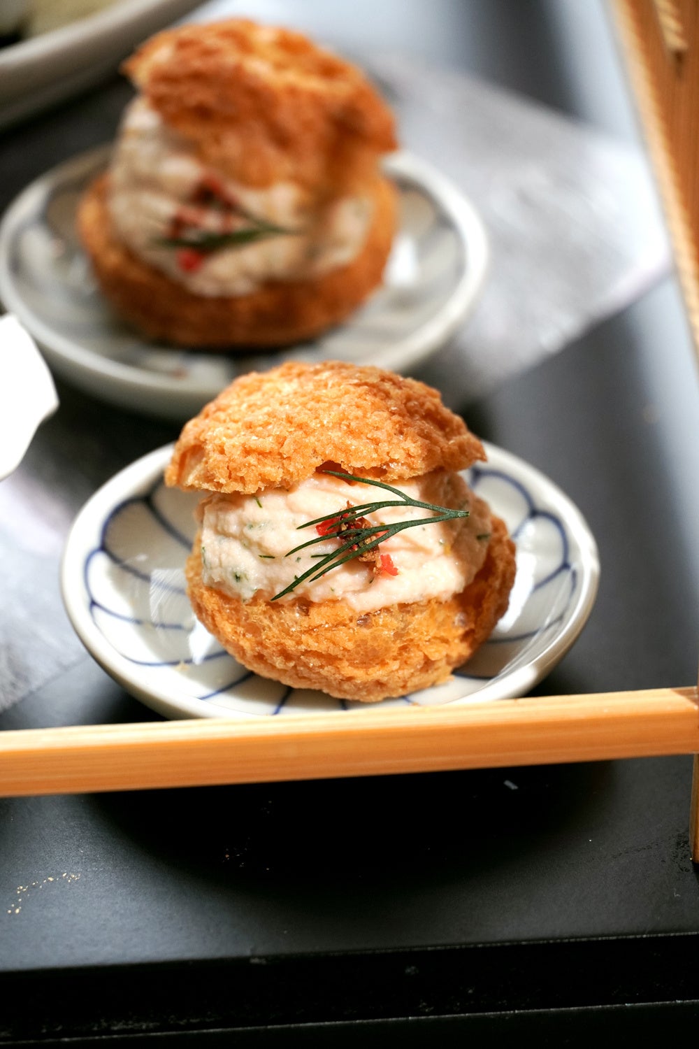 海老と筍のサンドイッチ、若芽、タルタル、粉山椒