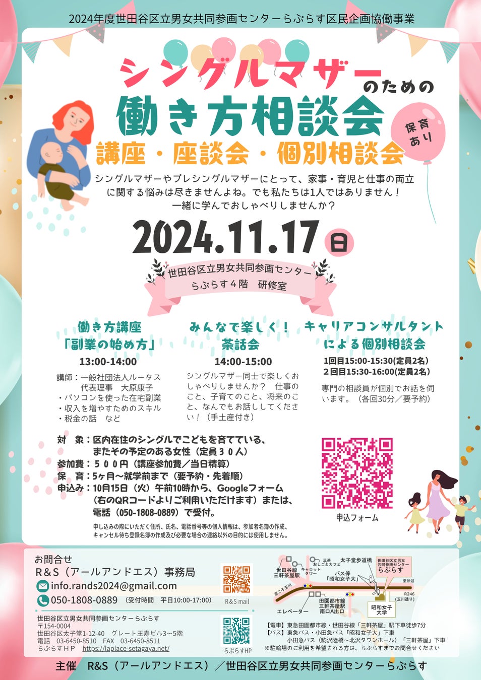 R&Sは、一般社団法人ルータス・株式会社ルータスワークス・NPO法人しんぐるまざあずふぉーらむの協力のもと世田谷区に生まれた任意団体です。この度、女性のエンパワーメント推進に取り組む、世田谷区立男女共同参画センターらぷらすと協働し、来る11月17日(日)に「シングルマザーのための働き方相談会」を開催する運びとなりましたのでお知らせいたします。