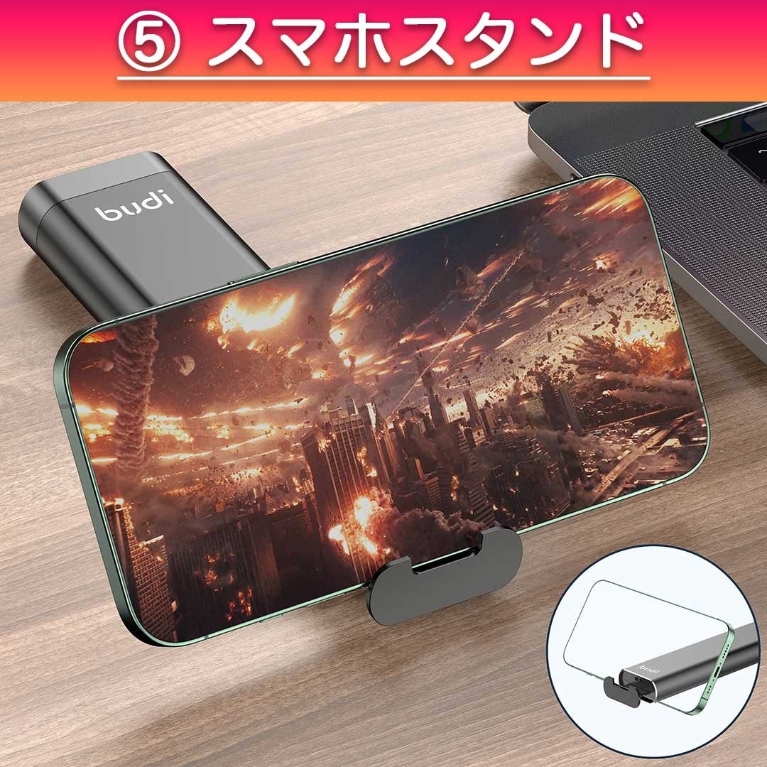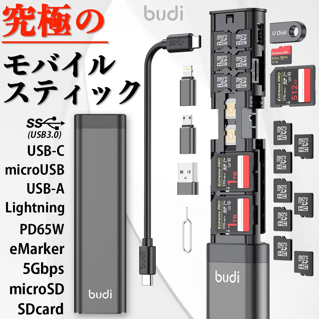 USB-CケーブルにUSB-A/microUSB/Lightningの変換アダプター、5Gbpsのカードリーダー、USBハブ、メディアカード20枚収納、スマホスタンド、SIMピンまで全て本体に搭載!