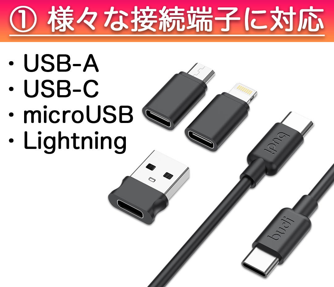USB-CtoCケーブルにUSB-A、microUSB、Lightningの変換アダプターを付属、殆どの端子に対応します!