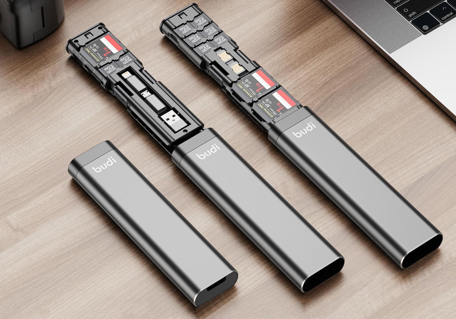 SDカード3枚、microSDカード15枚、nanoSIMカード2枚の合計20枚のメディアカード、USB-Cケーブル、3種類のアダプター、SIMピン、そしてカードリーダー、USBハブ、スマホスタンドまで全て本体に収納!