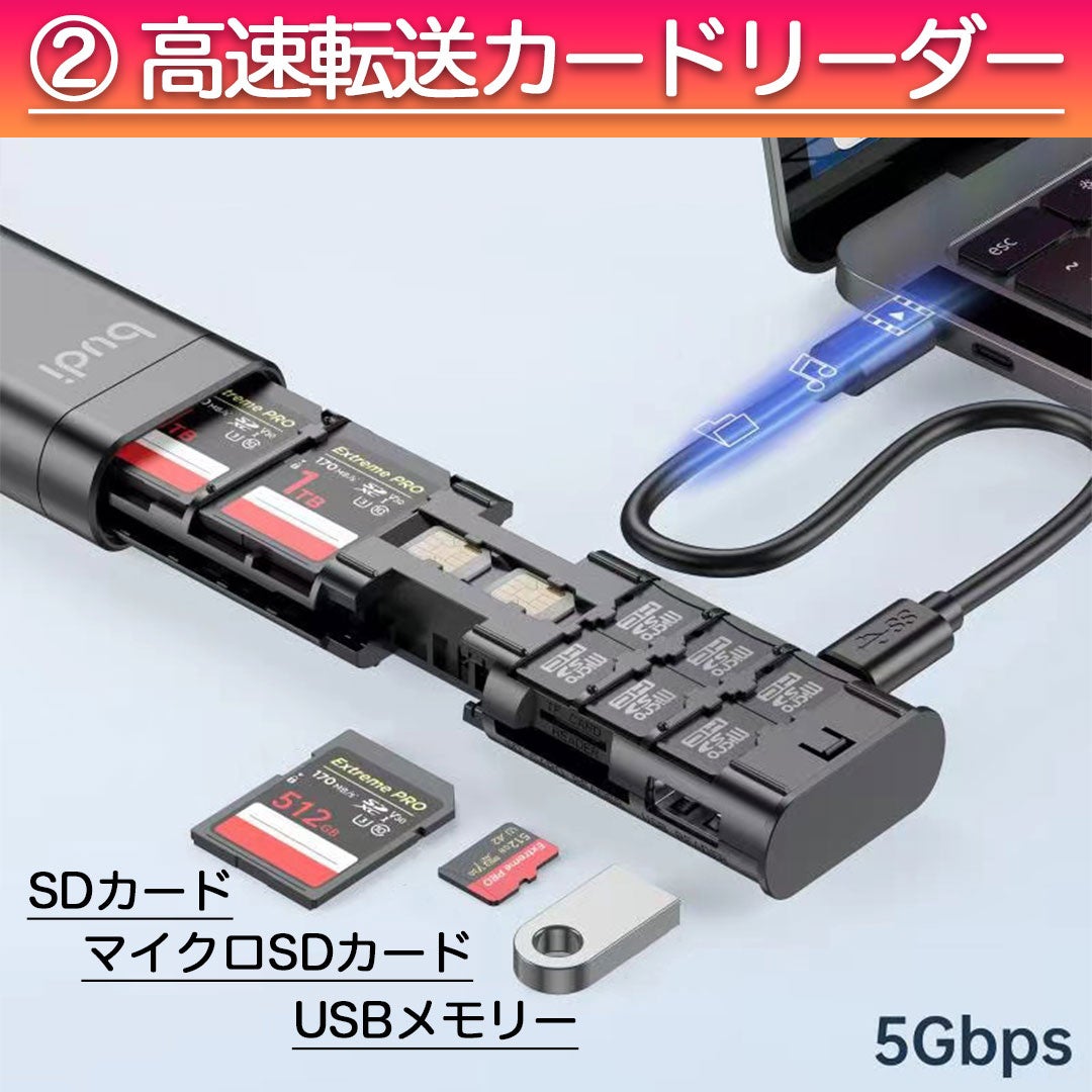 5Gbpsの高速転送カードリーダー、SDカード、microSDカード、USB-Aメモリースティックに対応し