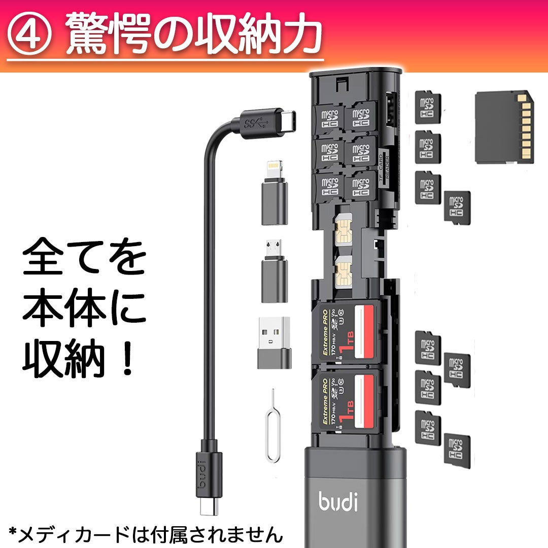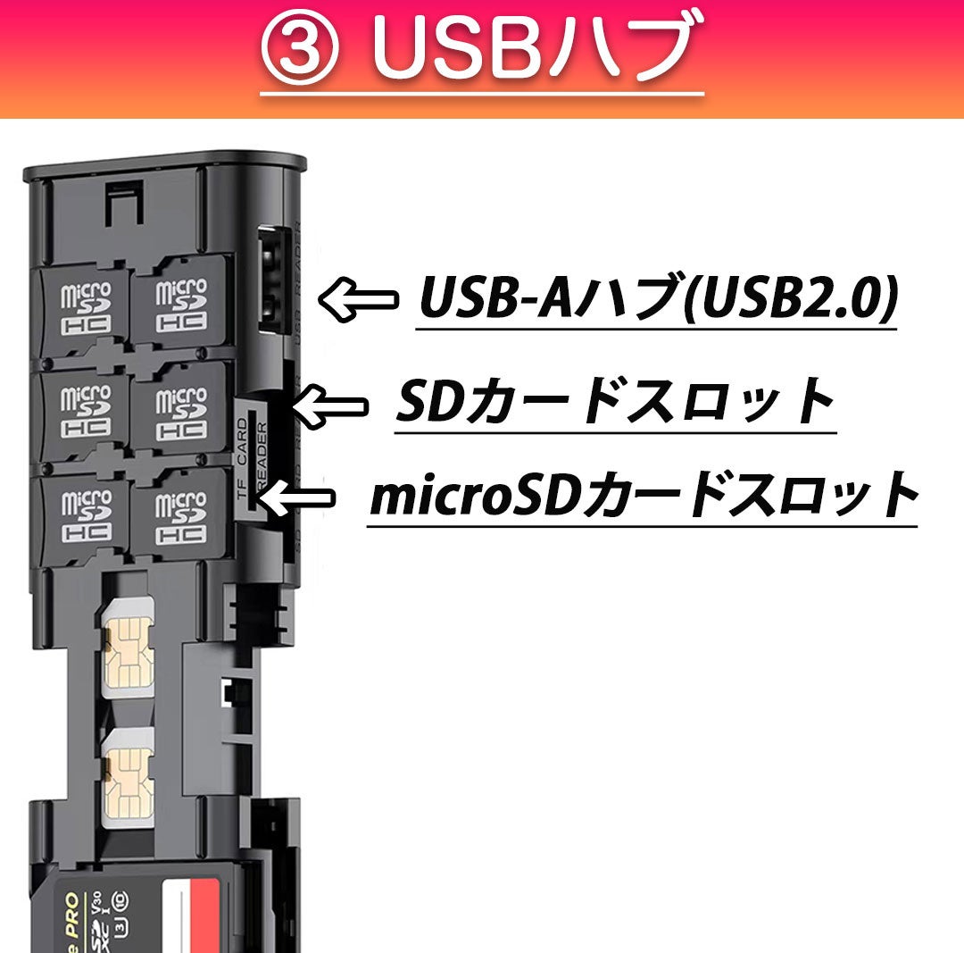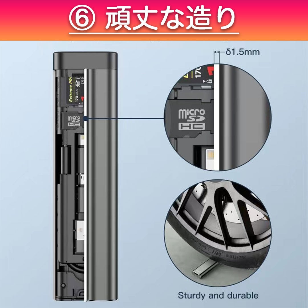 5.カードリーダーをご使用の際、SDカード、microSDカードは512GBの容量まで使えるのを確認しておりますが、全てのカードでのご利用を保証するものでは御座いません。特に安価なメディアカード、ノーブランド品では使用できない場合が御座います。