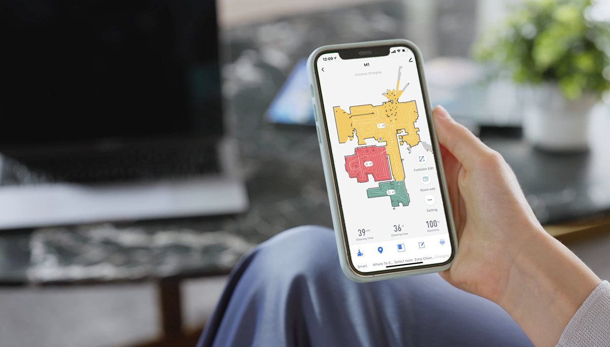 TECBOT専用アプリを使用することで、リアルタイムでお掃除の状況を確認できます。またモード変更や指定エリアの掃除など、生活スタイルに合わせた設定も可能です!