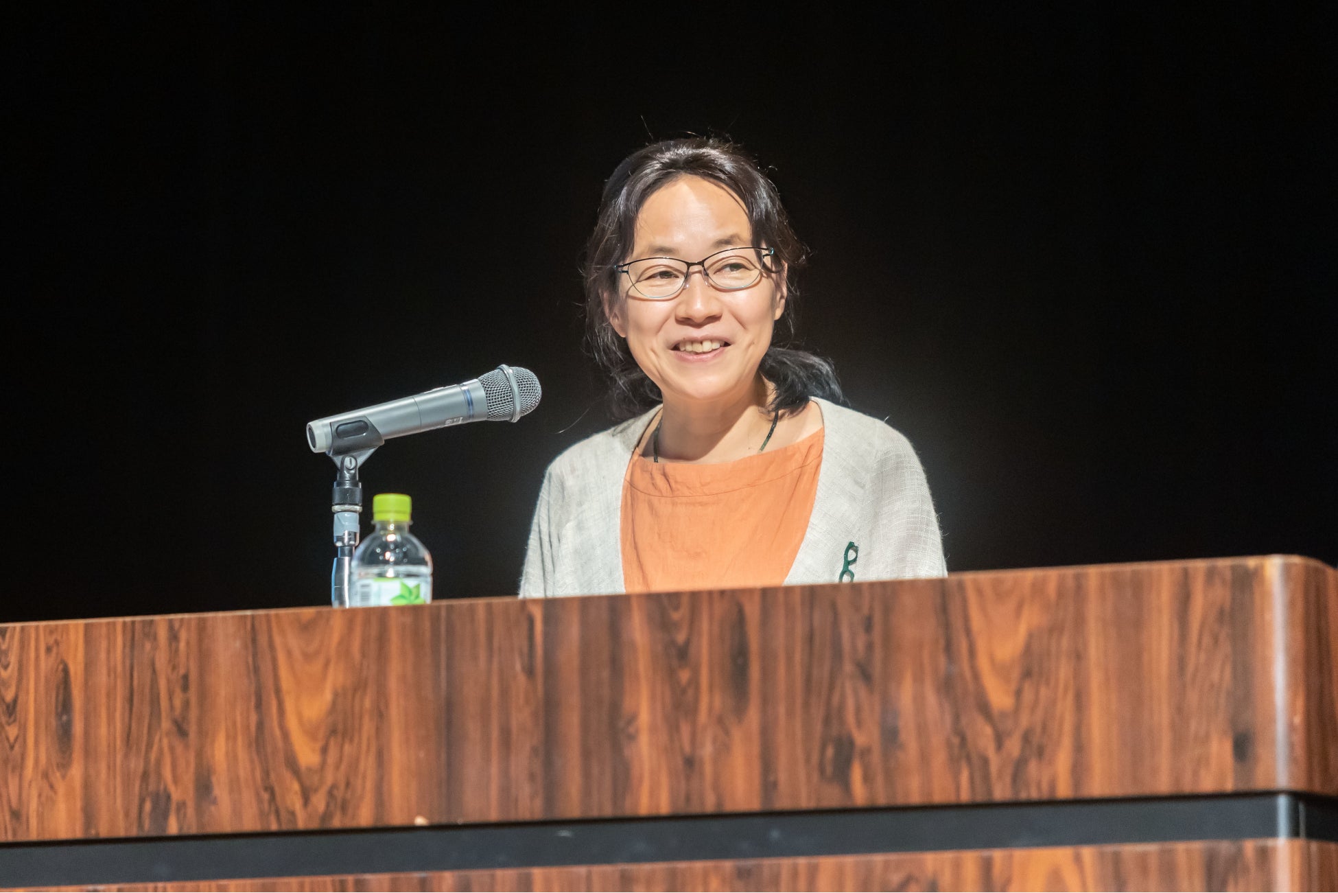 広島出身のマンガ家、こうの史代さんが、JMSアステールプラザで「マンガが描きたくなるお話」と題して講演しました。「マンガはどんな要素で成り立っているのか」などをテーマに、舞台設定やこま割りの工夫などについて分かりやすく解説。こうのさんが手元の紙に文字や絵を書き、カメラで映しだすユニークなスタイルで講演し、聴衆の質問にも答えました。
