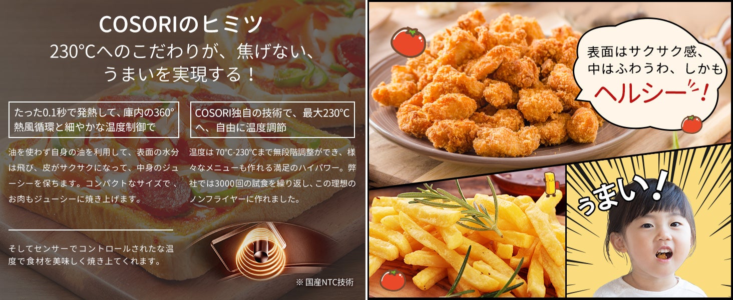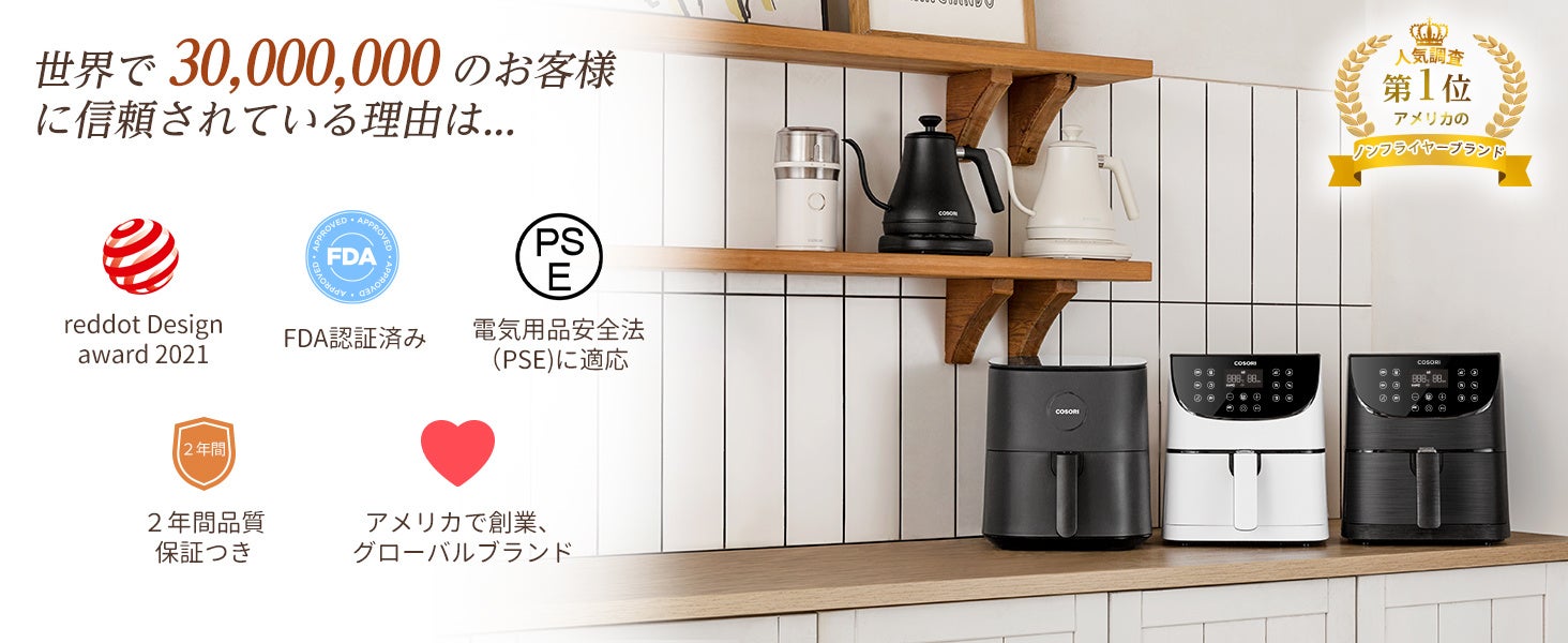 COSORIは、3千万以上のお客様から信頼されている上場企業Vesync傘下の人気ブランドです。一緒に楽しむヘルシーな料理を作る相棒であるCOSORIシリーズ製品。アメリカで創業し、弊社が生産したノーフライヤーは世界9ヵ国のEC市場で売上1位を獲得しました。2019年から東京に進出しております。COSORIは、料理をより楽しくするために特別に設計されています。