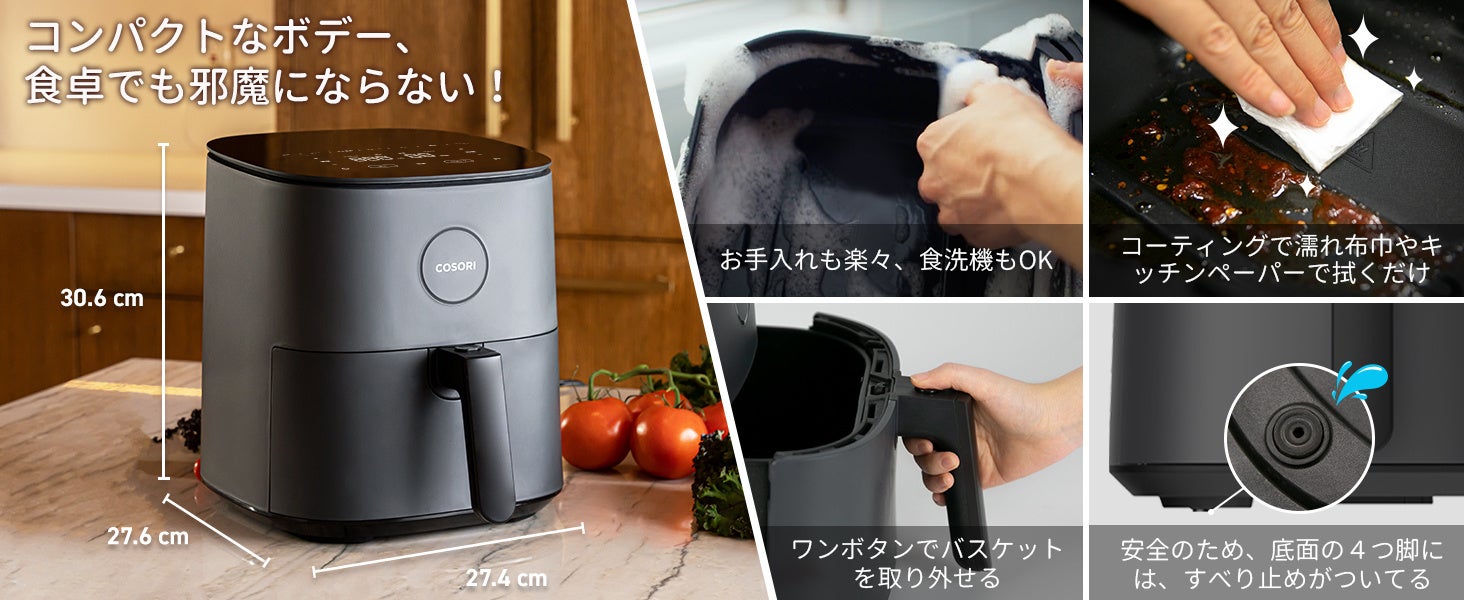 - コンパクトで大容量: COSORI PRO LEはコンパクトでスタイリッシュなデザインを持ちながら4.7Lの大容量バスケットを納めており、2〜4人分の料理はこれ一つで出来上がります。
