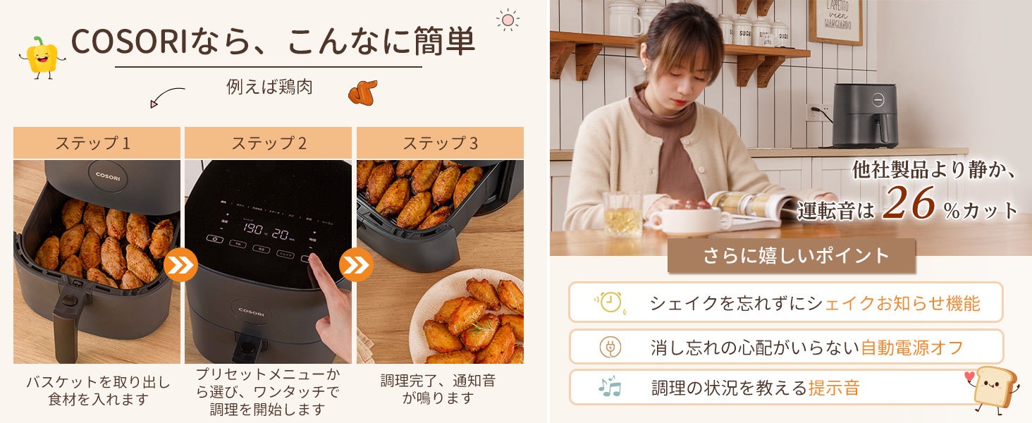 Cosoriは数々の受賞を受けたキッチン家電製品を開発し、料理作りの皆さんにインスピレーションを与えるブランドです。ユーザー体験の良い製品、スマートホームテクノロジー、そして活発なコミュニティにより、Cosoriは家庭での料理体験に革命をもたらします。ヘルシーで美味しい食事をユーザーに届けます。