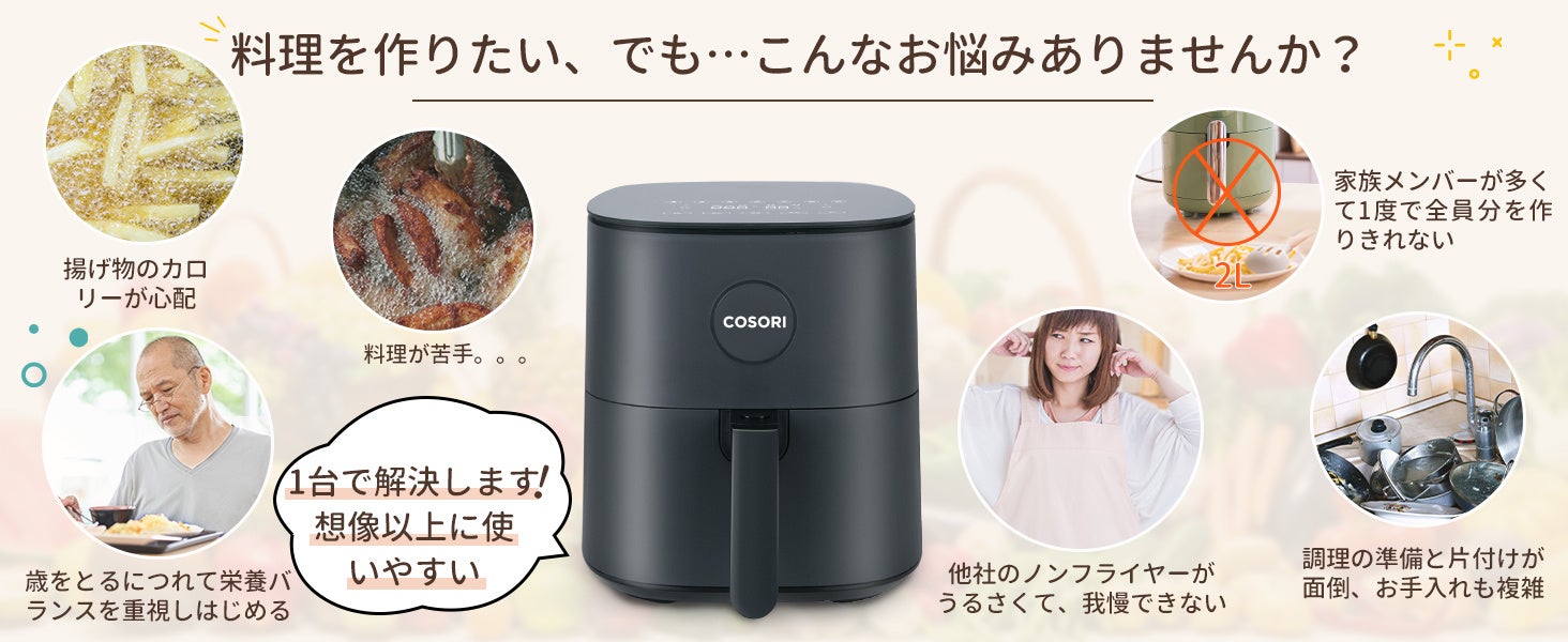仕事、育児、介護に…忙しすぎて家事する時間が足りない!もう少し自分の時間と余裕が欲しい!という悩みを抱えている方が今の時代でも少なくありません。「料理・洗濯・掃除」は三大家事と言われており、とりわけ料理作りは大きなウェイトを占めています。洗濯機、掃除ロボットの普及により洗濯と掃除の時間をだいぶ短縮できました。しかしながら「料理」の効率向上はまだ改善する余地があります。味と効率とも手放したくないという選択肢は今までになかったからです。そのバランスをうまく調和してくれるのはCOSORI PRO LEノンフライヤーです。