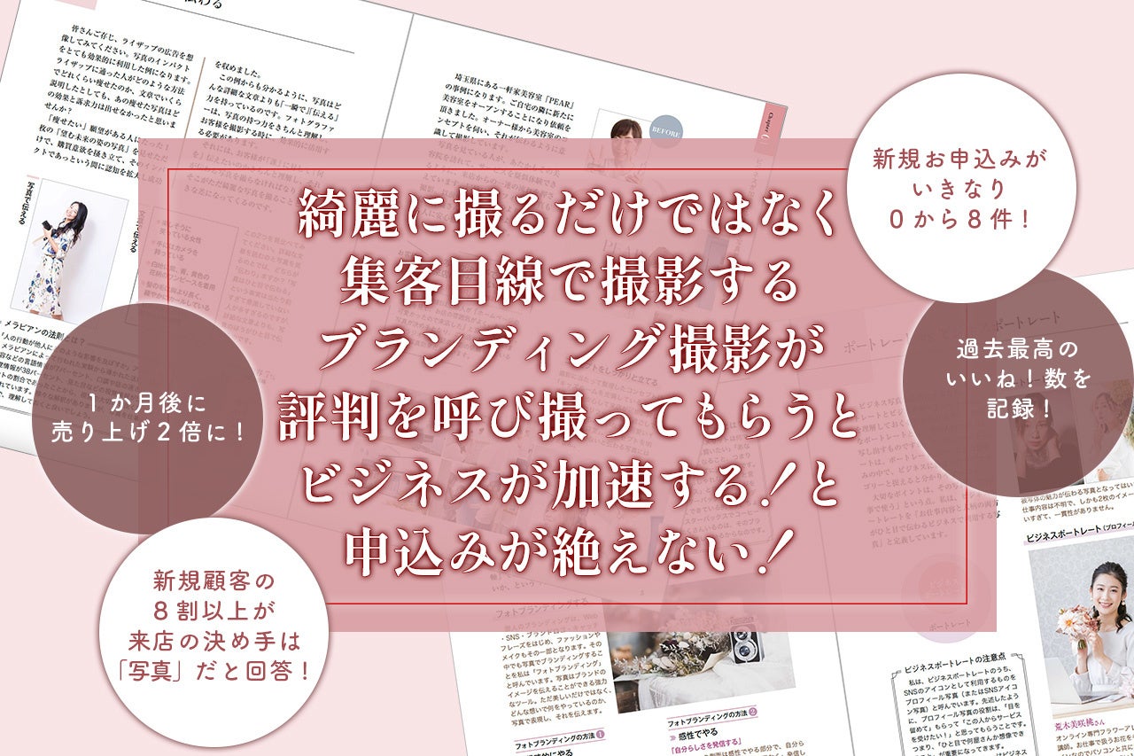 綺麗に撮るだけではなく集客目線で撮影するブランディング撮影が評判を呼び、撮ってもらうとビジネスが加速する! と申込みが絶えない!
