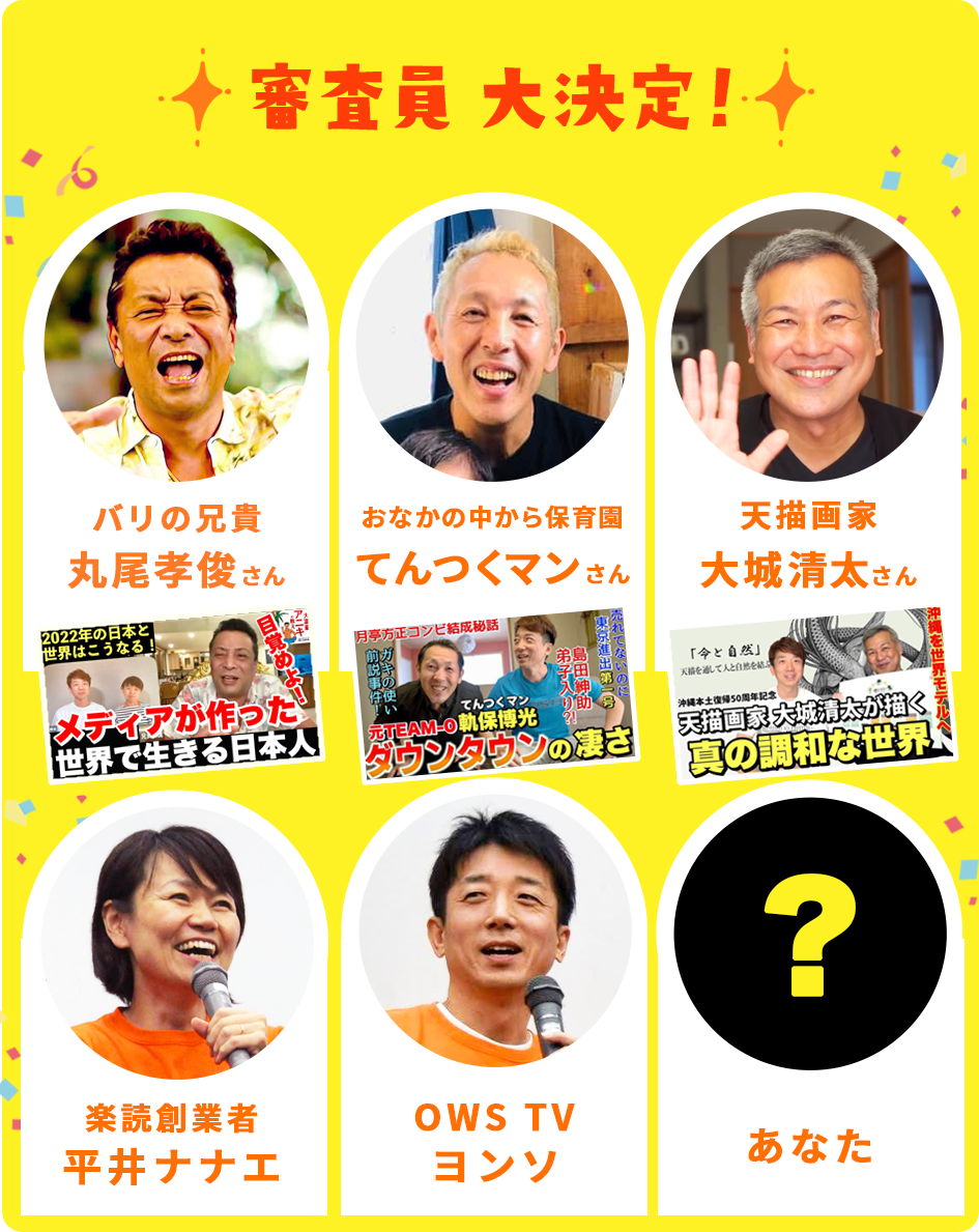 | 1. 丸尾 孝俊(映画『神様はバリにいる』バリの兄貴) https://www.youtube.com/channel/UCXxMBhRjxIGwVGbNXUmbP8A 2. てんつくマン(お腹の中から保育園、元お笑い芸人) https://www.youtube.com/channel/UCHWi2nW8_UVZibU5nBoQrRw 3. 大城 清太(黄金言葉(クガニコトバ)の天描画家) https://youtu.be/L5ZYbFM1SCs 4. ヨンソ(YouTubeチャンネル登録10万人 OWS TV) https://www.youtube.com/channel/UCCTdYItHTc6aueMRyRVbdPQ 5. 平井 ナナエ(世界一の速読教室「楽読」創始者) https://www.youtube.com/channel/UC5Qy8k_hK7eWs0pdF7rxiAA |