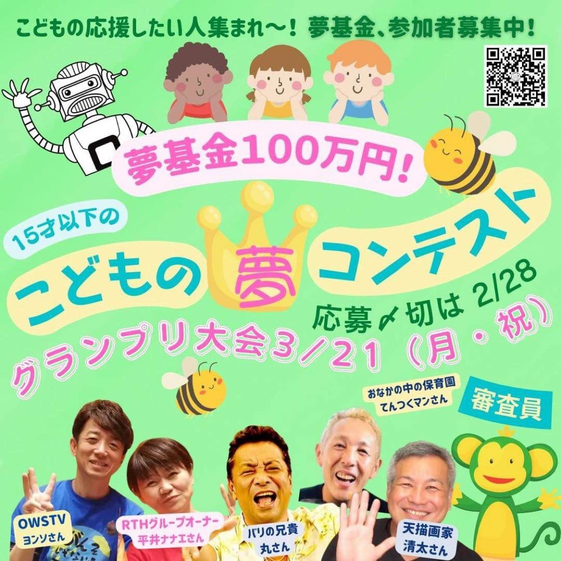 【こどもの夢コンテスト】夢を実現できるチャンス(応援金100万円)お子さんの「やりたい」想いを込めた4分動画 募集中! ※国内外問わず、全世界から応募可能→〆切は2/28(月)