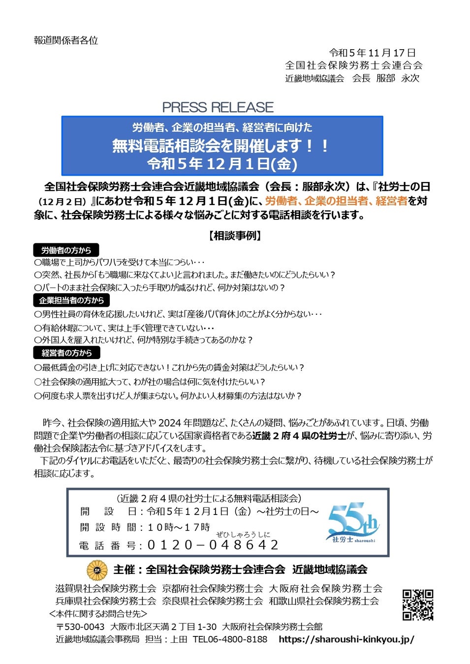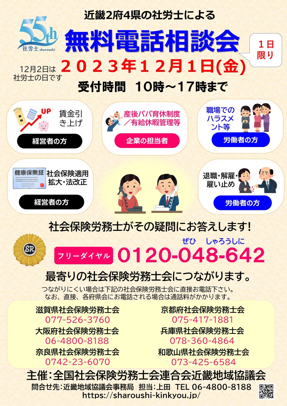 私ども全国社会保険労務士会連合会 近畿地域協議会(会長 服部 永次/近畿2府4県の社会保険労務士会)では12月1日(金)に、近畿2府4県の事業主様、人事・総務担当者様、労働者の皆様に向けて無料の電話相談会を開催することとなりました。
