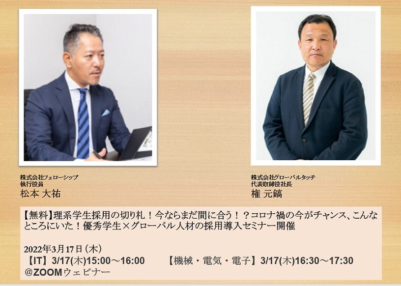 グローバル人材に特色を持つ人材サービスを提供する株式会社フェローシップ(本社:東京都千代田区丸の内、代表取締役社長:小山 剛生 以下、フェローシップ)とグローバル人材をキーワードに国内・国外を問わずあらゆる人材の採用・就業をサポートする人材採用・育成サービスを提供する株式会社グローバルタッチ(本社:東京都新宿区、代表取締役社長:権 元鎬 以下、グローバルタッチ)は、理系学生採用に悩む事業者さま向けに、外国人材採用を徹底解説する無料セミナーをオンラインで開催します。