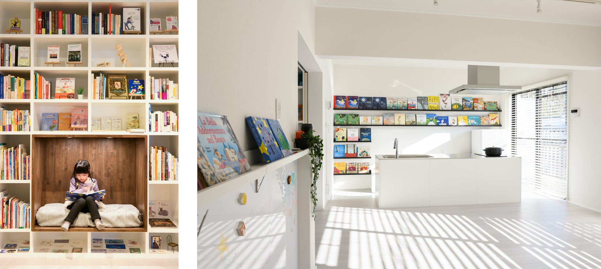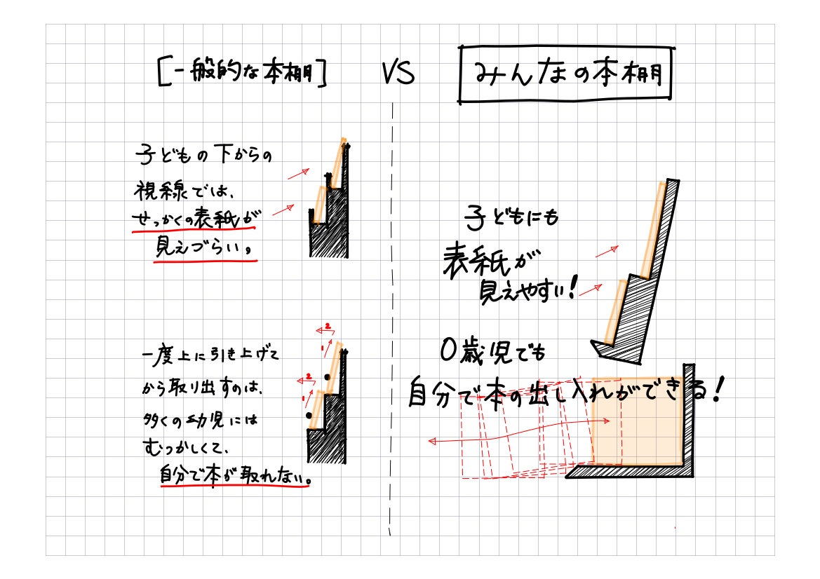 子ども目線でも本棚上部に置いた絵本の表紙はしっかり視認でき、子ども自身がついつい手に取りたくなります。また下部は床との設置面に斜めの断面形状をした材を使用しているため腕の力が小さな子どもでも自分で取り出し、片づけがしやすい設計です。
