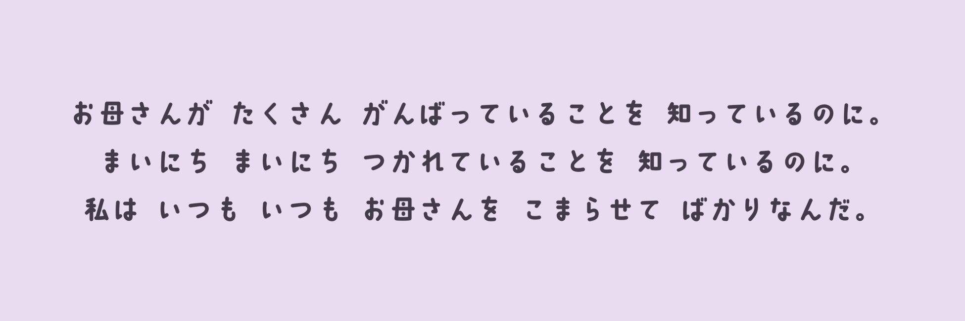 今作を描き終えて、 母がこれまでどれほど頑張ってきてくれたのか、 親という存在はとてもありがたいものなんだと、 改めて気づくことができました。そしてぜひ、この作品を通して、お父さんお母さんの皆さんに感じてもらいたいことがあります。 うまくやれていない気がする時、 つい怒ってしまう時、挫けそうになる時、 そんな時があっても大丈夫。 私たち子どもはお母さんやお父さんが、 自分たちの為に頑張ってくれていることを、ちゃんと分かっています。 その感謝を今はうまく伝えられないだけ。 今もひとりで懸命に頑張っている、 お母さんやお父さん。 頑張っている自分を褒めて、息抜きをしてみてください。そしてまた、子どもにたくさんの愛を伝えてあげてください。