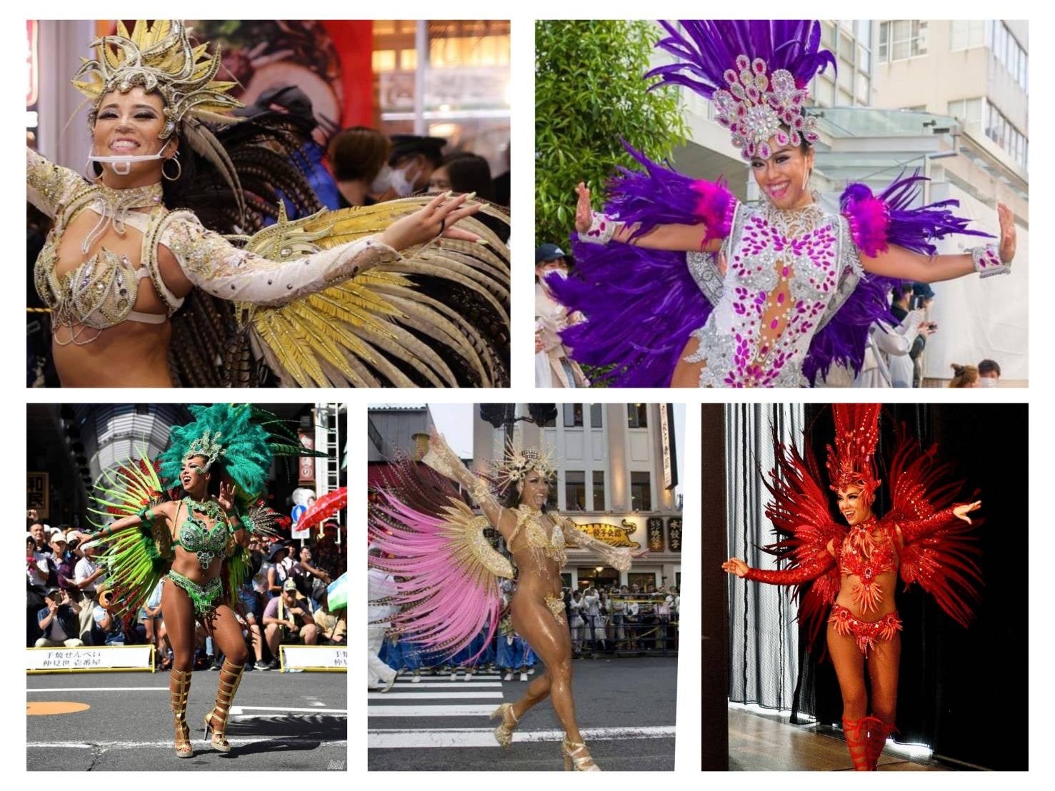 5名の華やかなダンサー(Koko、Anri、Haruna、Mika、Hiei)と、陽気なリズムを奏でるバテリアにより新たに結成された「六区ゴールデンサンバ」。