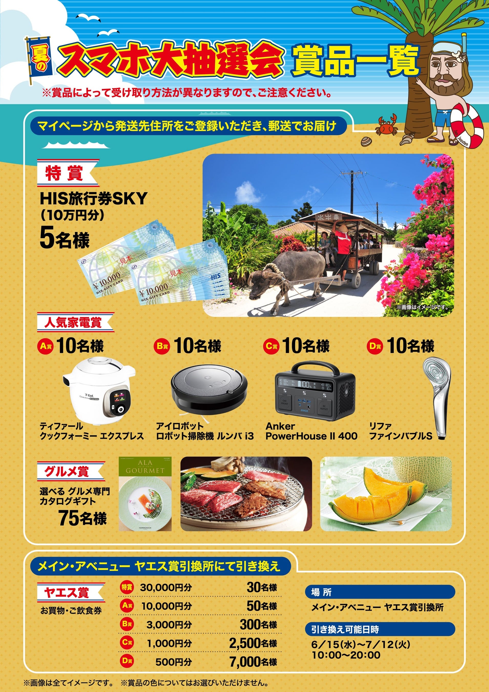 賞品は特賞に「HIS旅行券SKY(10万円分)」を5名様にプレゼント。さらに、「人気家電賞」や「グルメ賞」、「ヤエス賞(ヤエチカ お買物・ご飲食券)」3万円分などもラインナップ。