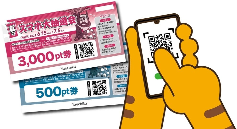ヤエチカ公式LINEとお友だちになり、配信クーポンを引換所でご提示いただくと、3,000ポイント券を1枚プレゼント ※お1人様1回限り