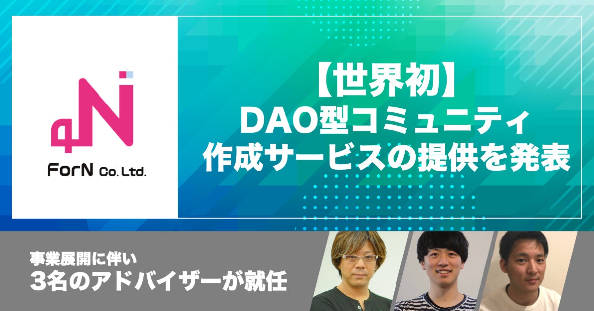 株式会社ForN、世界初のDAO型コミュニティ作成機能の提供を発表。また、ForNのアドバイザーに⽟舎直⼈氏、⼩澤孝太氏、中村昂平氏が就任