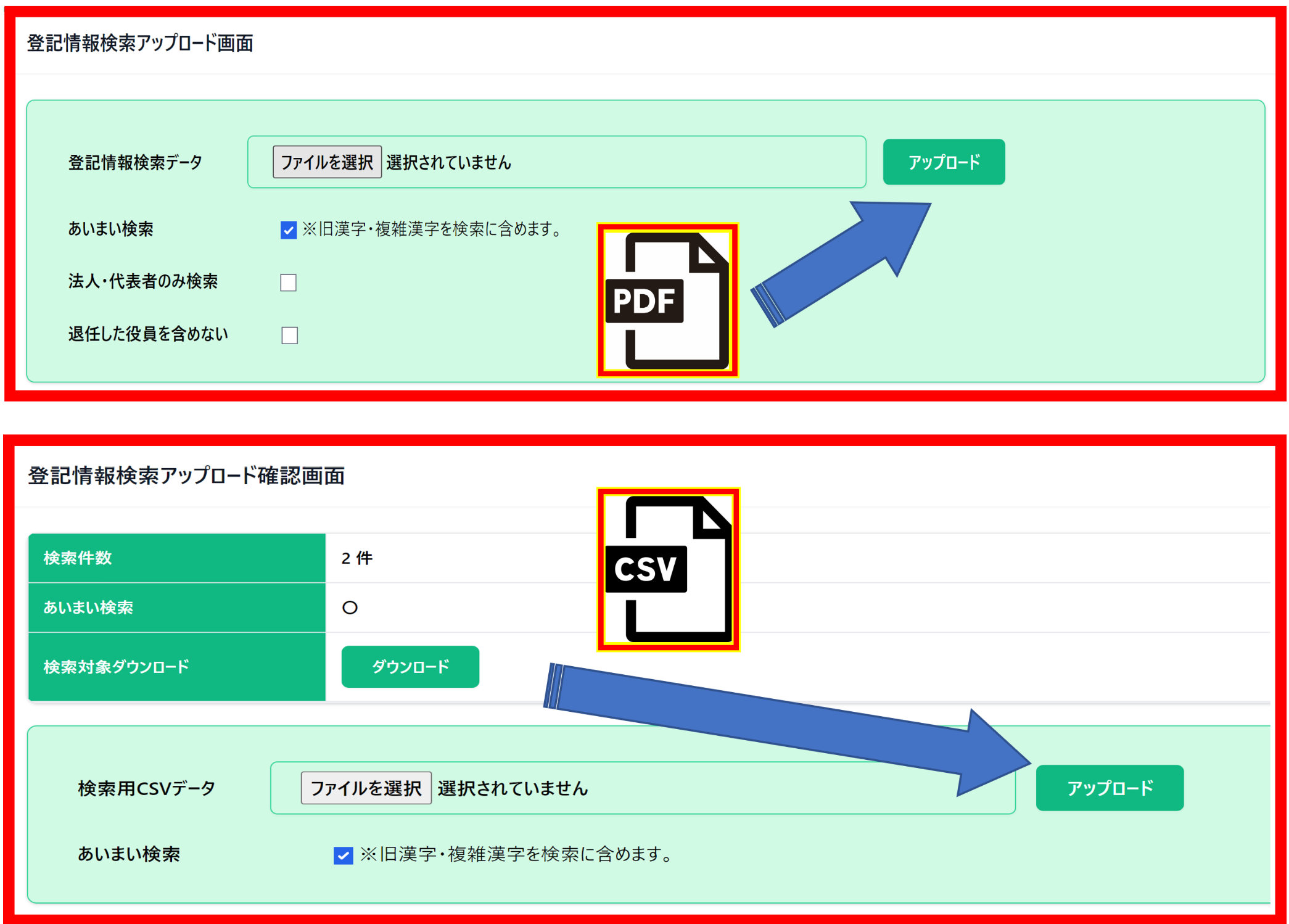 登記情報のPDFファイルを、『JCIS WEB DB Ver3』の画面上からアップロードするだけで、記載されている役員及び商号を自動で解析し、弊社データベースと自動で照会します。照会した結果のデータは、PDFまたはCSVでダウンロード可能です。