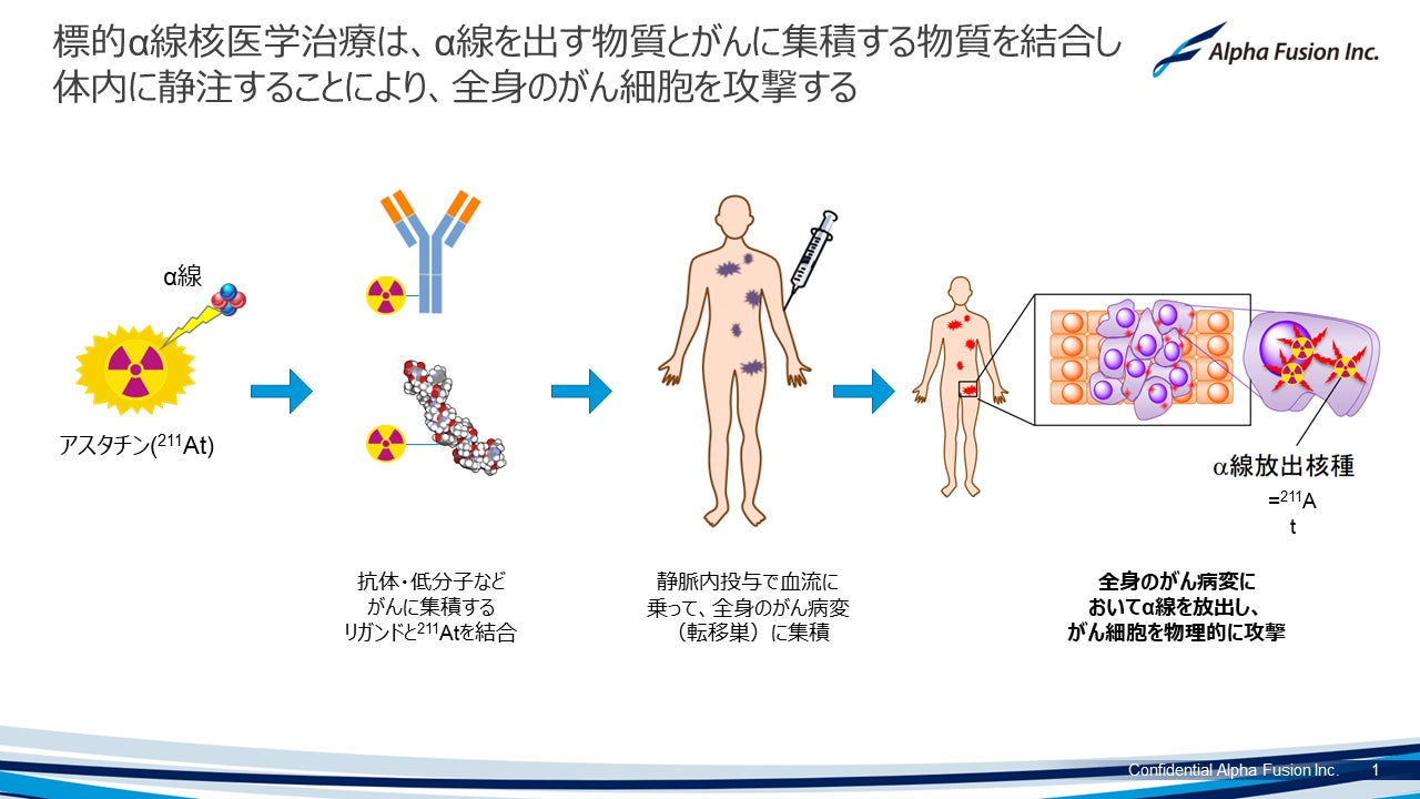 アルファフュージョンは、アスタチン(At-211)創薬プラットフォームの世界のリーディングカンパニーとして、アスタチンの特性を活かした複数の新規抗がん剤を創出し、多くのがん患者やその家族に希望と、がんと戦う医療従事者に強力な武器を与えることを目指しています。