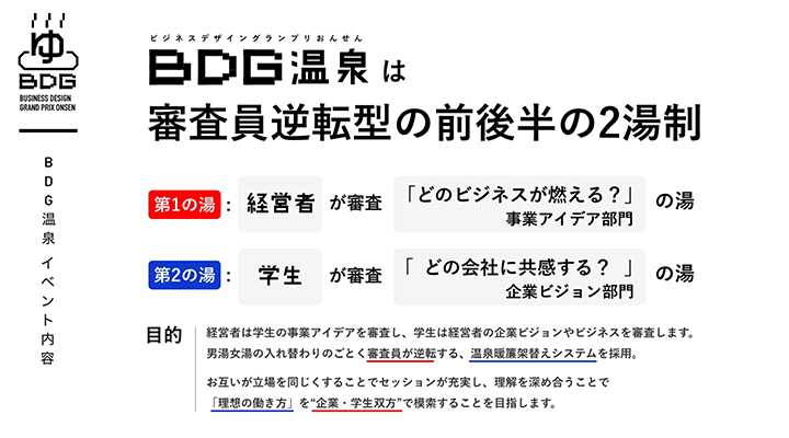 ビジネスデザイングランプリ温泉では、経営者が学生の「事業アイデア」を審査し、学生が経営者の「ビジョンやビジネス」を審査。男湯女湯入れ替わりのごとく審査員が逆転する、のれん架替えシステムの2湯制グランプリというコンセプトで開催しました。