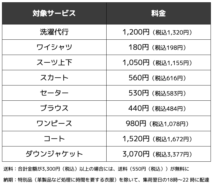 自社物流による効率的な集配により往路送料を550円まで抑え、さらに3,300円以上の場合には送料無料となります。洗濯代行とクリーニングを同時にご利用いただくことで安く・早く・便利なランドリー体験をご提供しております。また、クリーニング取り扱い開始を記念に新規会員登録20%OFFキャンペーンを実施しております。