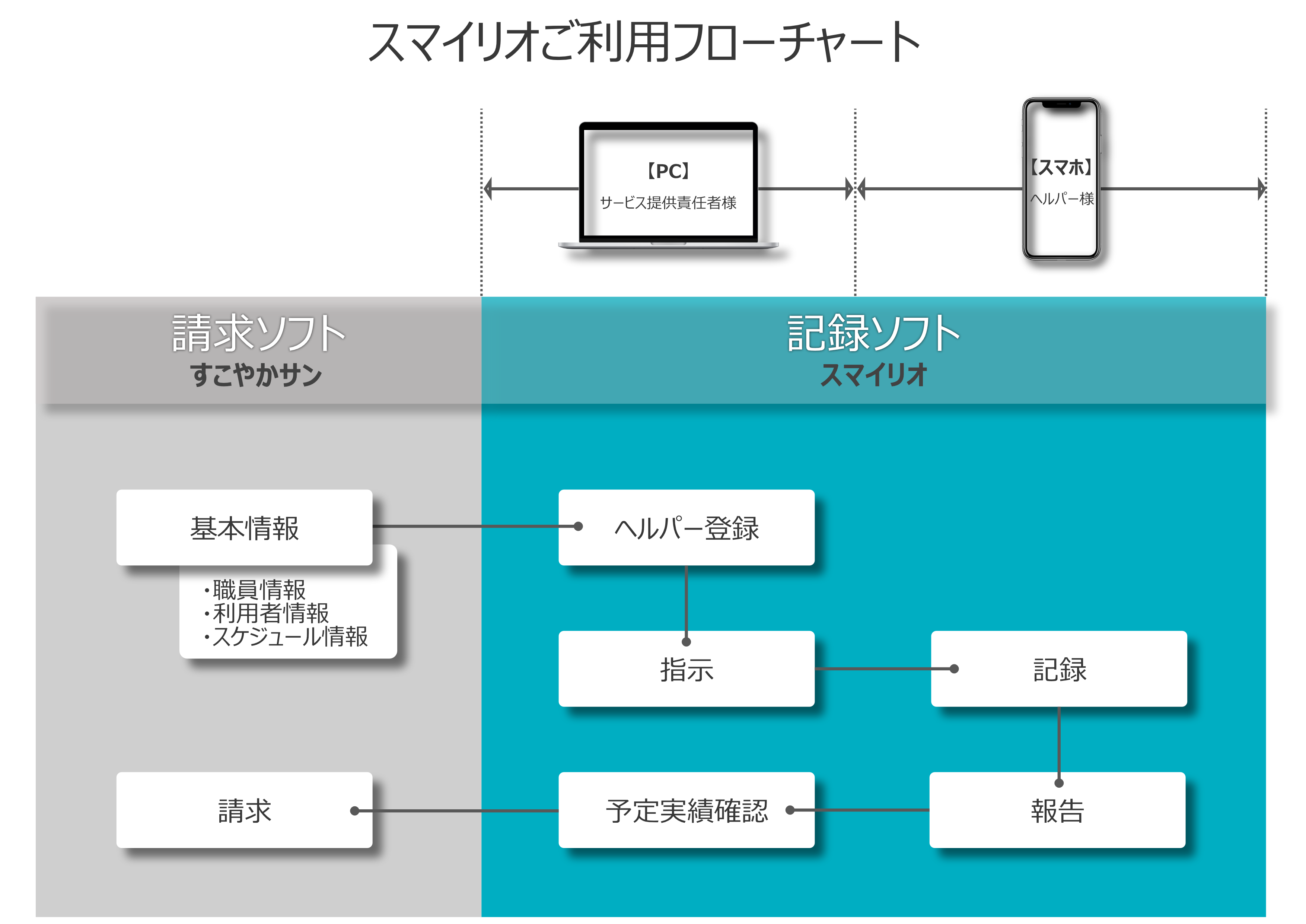 訪問介護記録アプリ「スマイリオ」と請求システム「すこやかサン」が自動連携。