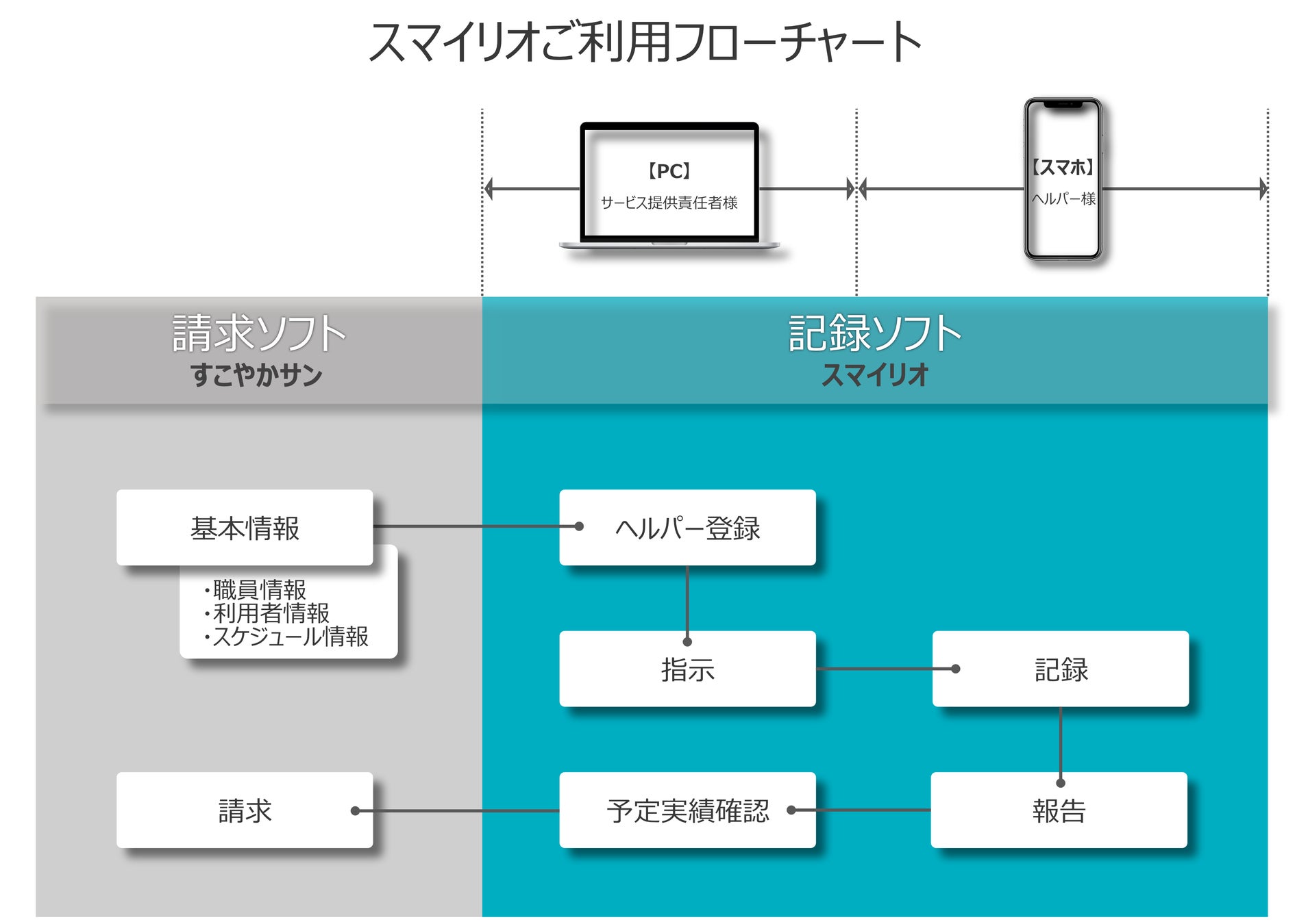 これまでの「すこやかサン」は、施設系サービス及び通所系サービス向けのモバイル記録支援サービスを保有しておりましたが、「スマイリオ」との連携により、施設外で記録活動を行う訪問介護業務が、より実施しやすくなりました。