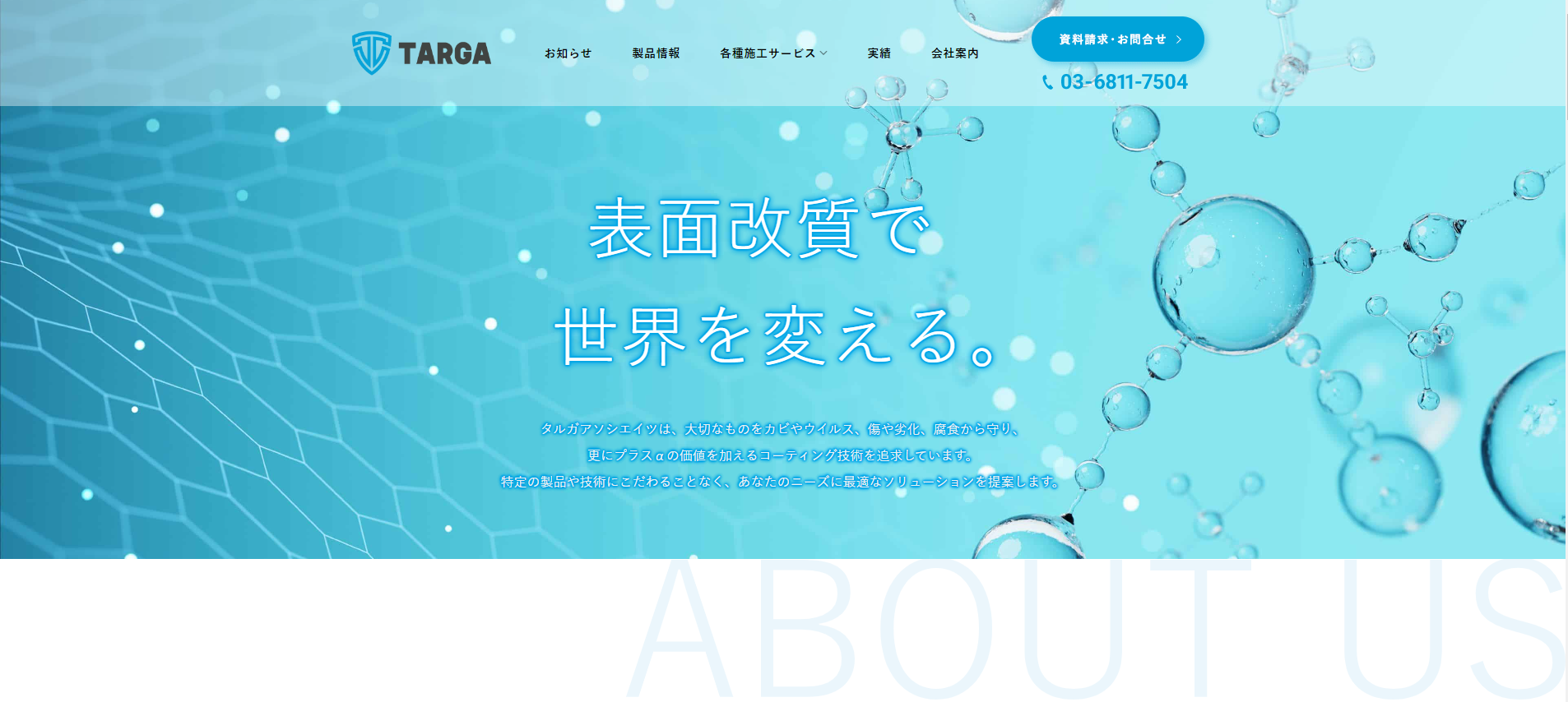 コーティング業界での⻑年の経験とネットワークを活かし、コーティングに関する独⾃技術やオリジナル製品の開発、施⼯まで幅広く提供できることを知っていただくため、HP(URL: https://www.targa-a.com/ )をリニューアルしました。導⼊実績や提案を充実させることで、”表⾯改質 ”を通じた「既存の施設・設備を活かした問題解決⽅法」をお伝えします。