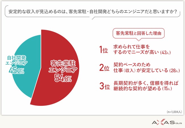 - ①安定的な収入 「求められて仕事をするのでニーズが高い」などの理由から、54.8%が客先常駐エンジニアの方が安定的な収入が見込めると回答。
