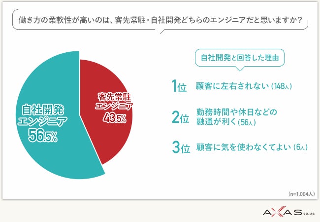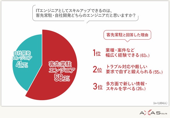 アクサス株式会社(本社:東京都新宿区、代表取締役:駒木 俊祥、以下アクサス)は、客先常駐と自社開発双方の経験があるエンジニア1,004名を対象に、「客先常駐エンジニア・自社開発エンジニアそれぞれの魅力」に関する調査を実施いたしました。