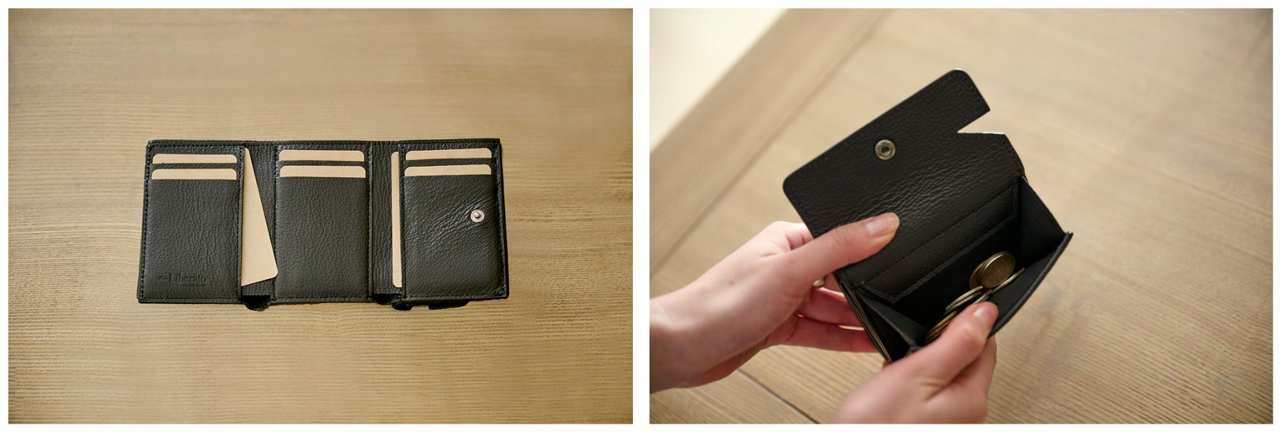 ・ 最大で約12枚のカード収納が可能。フロントにあるコインケースは大容量で視認性が高く、フラップボタンで小銭をすぐ取り出せます。