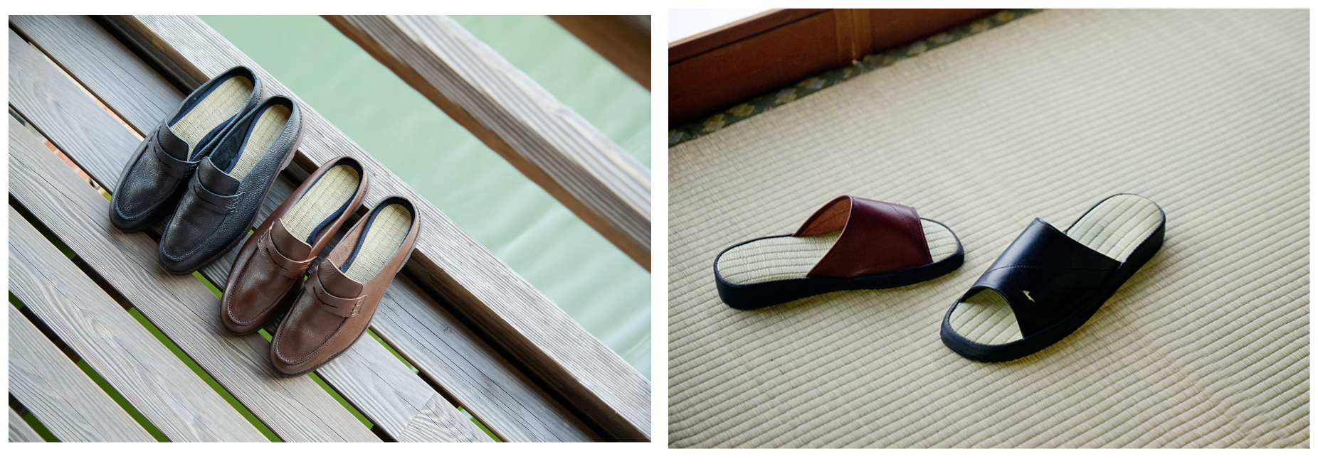 当社は、“もとは捨てられていた九州産の畳端材”と“姫路産の高品質レザー”の異素材のコントラストをアイテムに用いており、これまで、インソールに畳を使った「畳ローファースリッパ」、「畳サンダルスリッパ」のシューズアイテムを展開しています。