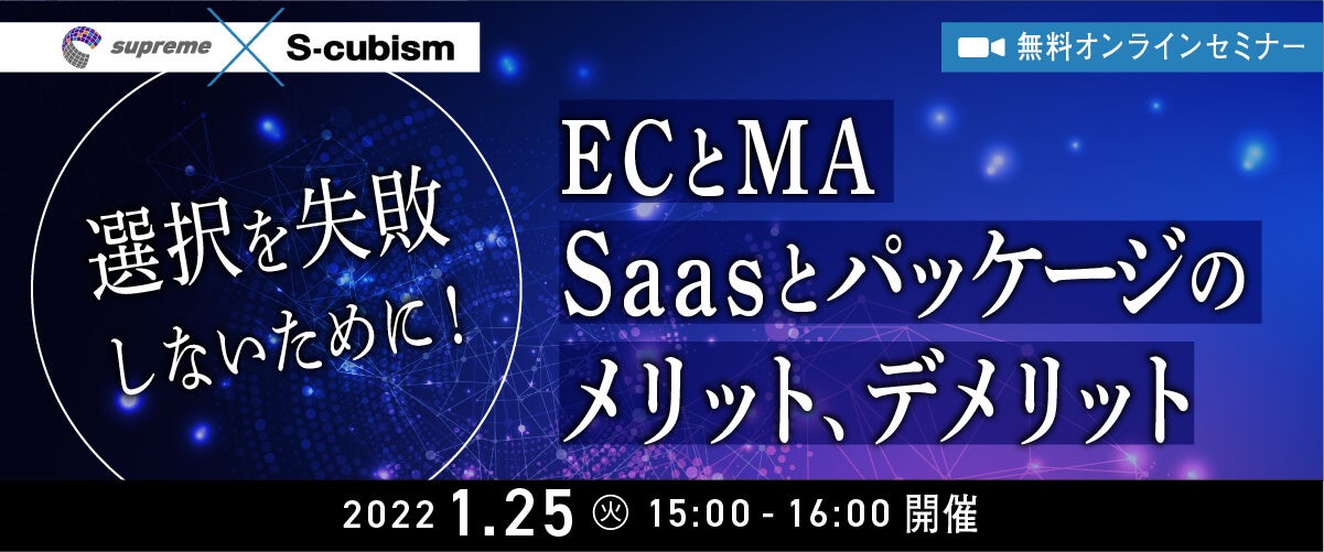 スプリームシステム株式会社(本社:東京都豊島区、代表取締役:佐久間 卓哉)は、2022年1月25日(火)15:00より、ECやマーケティングオートメーションツール(MAツール)導入の際の2つの主要な形式(SaaS・パッケージ)の詳細比較についてのウェビナーを開催いたします。ECやシステム領域に知見の深い株式会社エスキュービズム様との共催になりますので、ECやMAツールの導入をお考えの皆様は、是非ご参加ください。