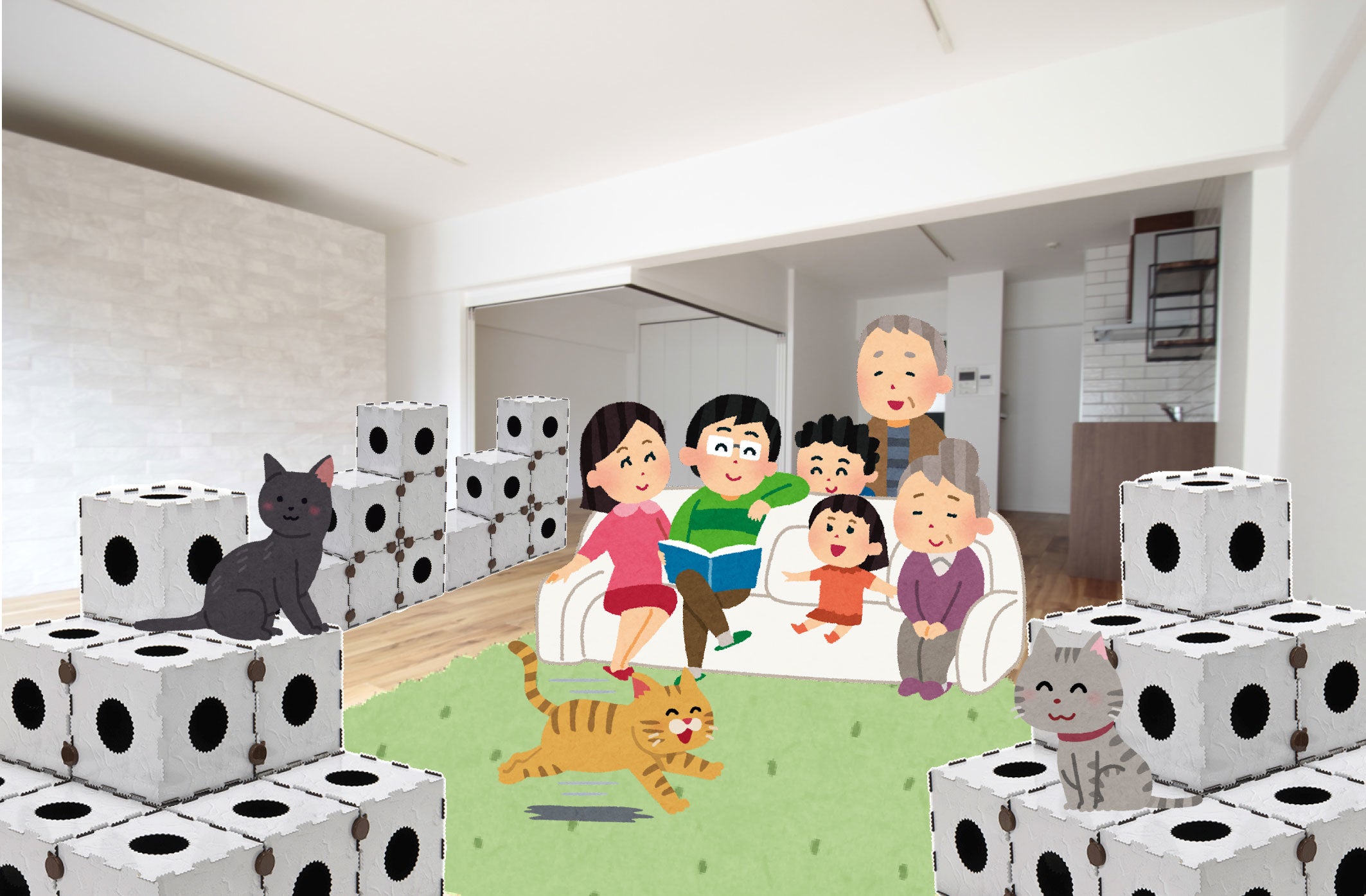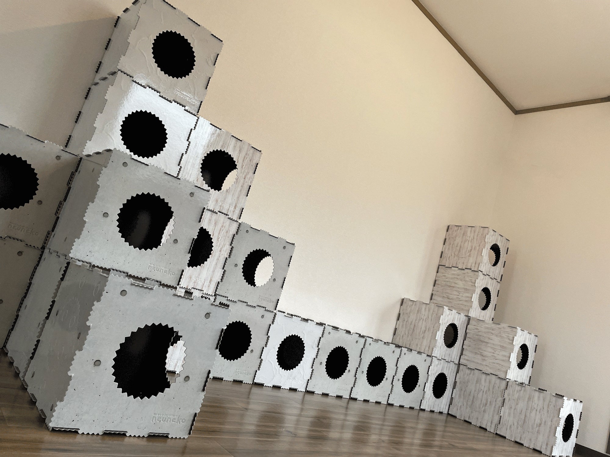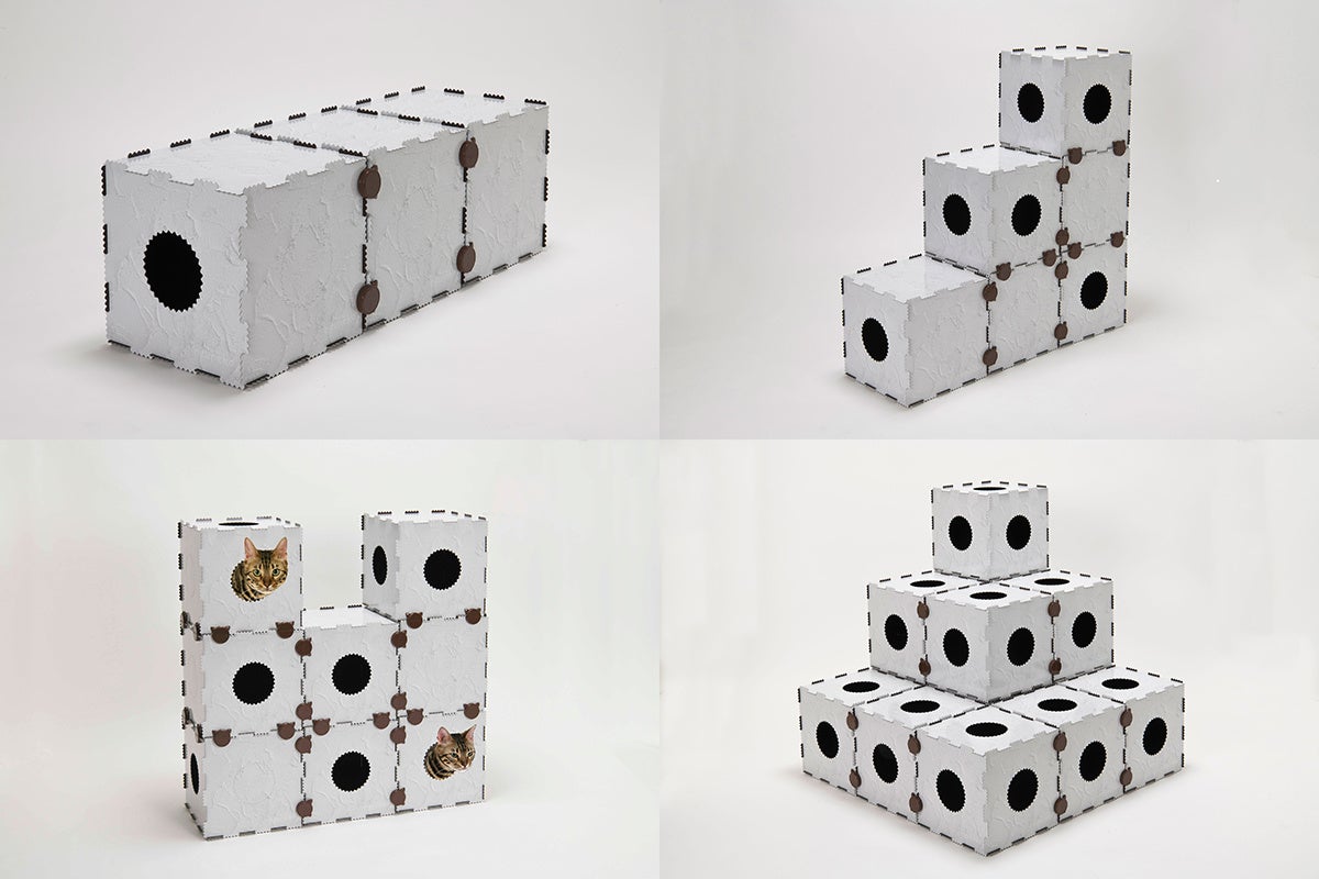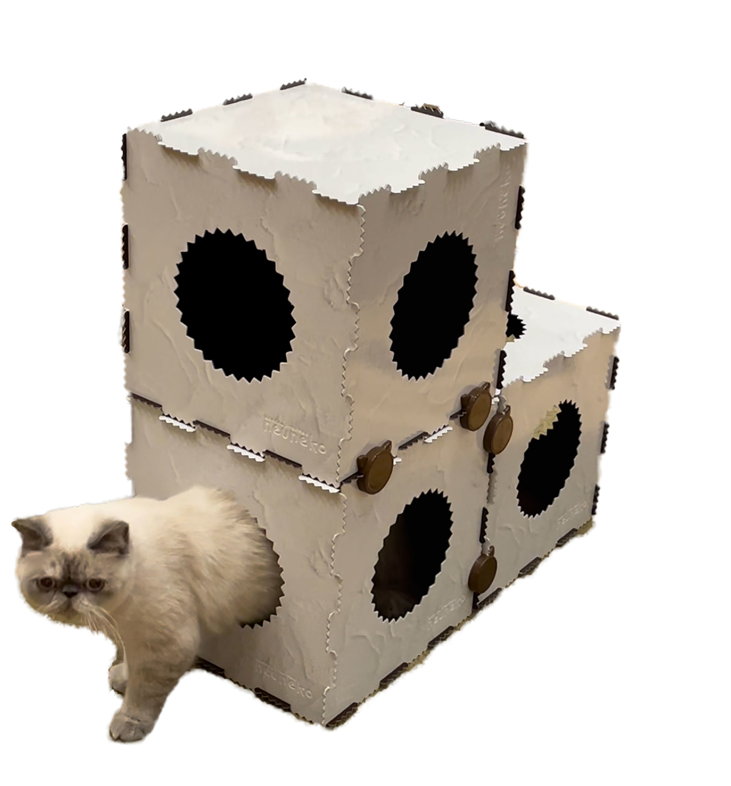 猫の行動学に基づいて設計されており、猫の「外敵から隠れる」といった習性や、運動不足・ストレスの軽減に対応した連結機能・カスタマイズ機能を有するほか、サイズ感にもこだわりを追求。猫の成長に合わせた組み替えも可能としている。結合突起部分とホールの部分には猫が好む「ギザギザ」を施し、猫の体が触れることで毛繕いの効果も期待できる。