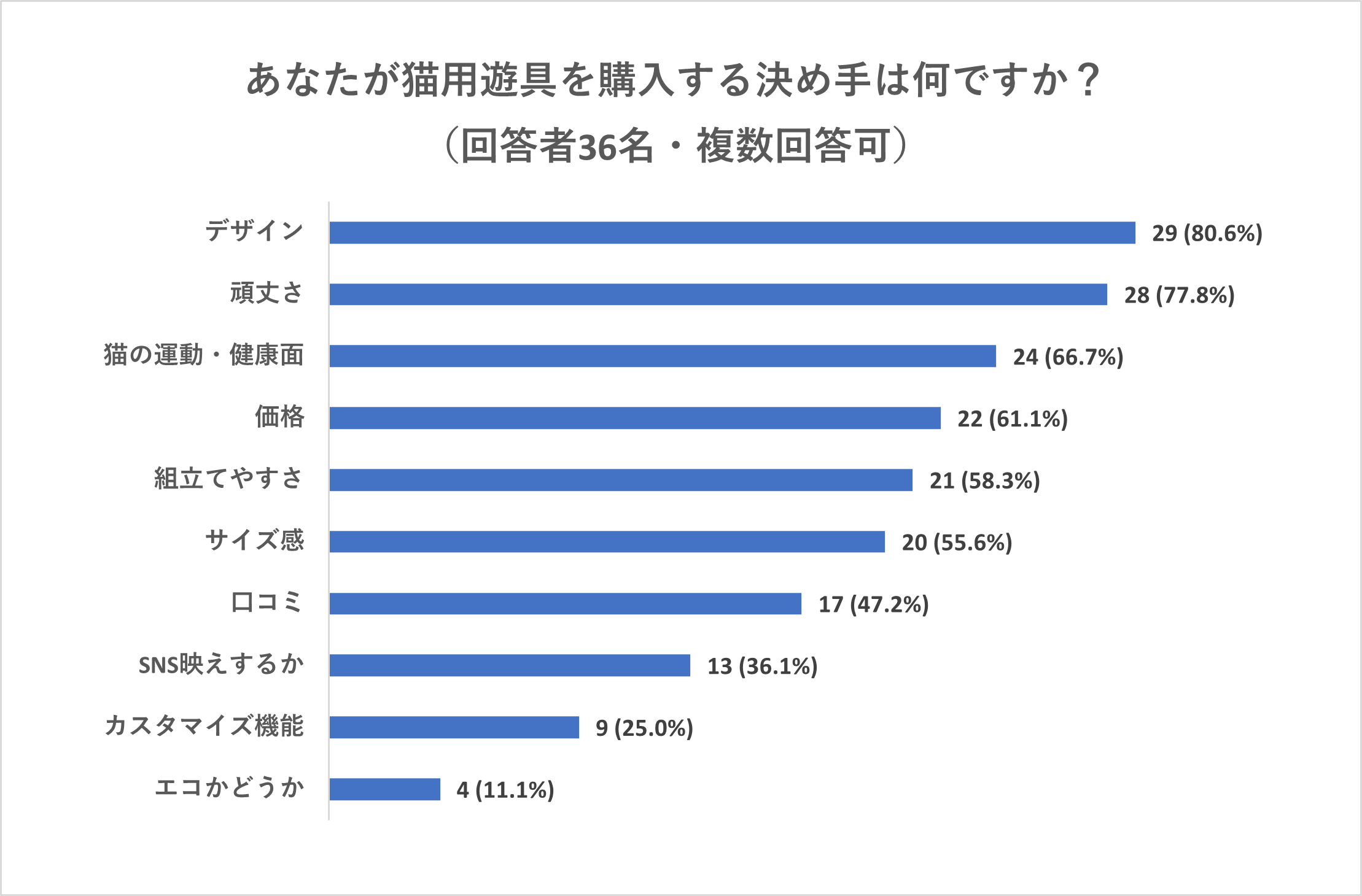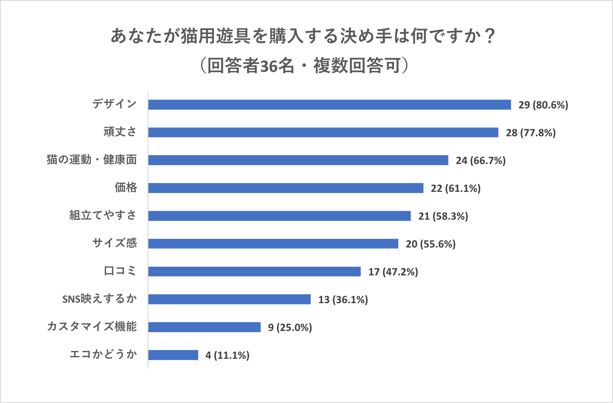 猫を飼っている方への意識調査をしたところ、猫用遊具を購入する決め手として「猫の運動・健康面」を気にして遊具を選ぶ方が全体の7割弱という結果になりました。(自社調べ)