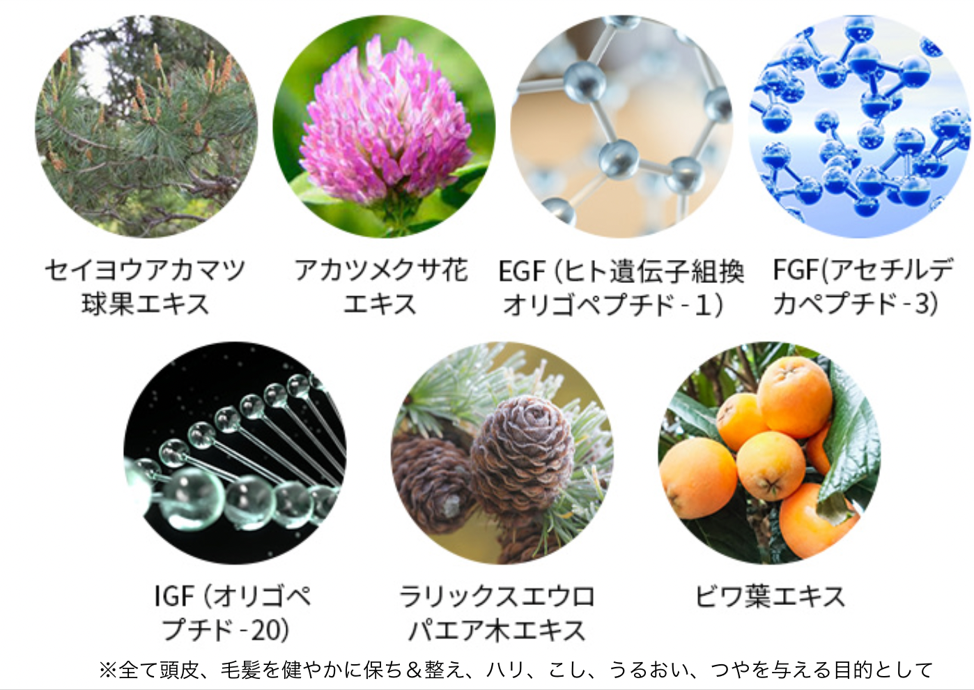 ヘアメンテナンスローションの【黒髪×白髪ケア】のW成分は、毛髪業界関係者の間で広く知られる美容液成分!なかでもリデンシル(セイヨウアカマツ球果エキス)※⁴、キャピキシル(アカツメクサ花エキス)※⁴、EGF(ヒト遺伝子組換オリゴぺプチド-1)※⁴、FGF(アセチルデカペプチド-3)※⁴、IGF(オリゴペプチド-20)※⁴、ダークニル(ラリックスエウロパエア木エキス)※⁴、ビワ葉エキス※⁴の7つの【黒髪×白髪ケア】成分を採用!