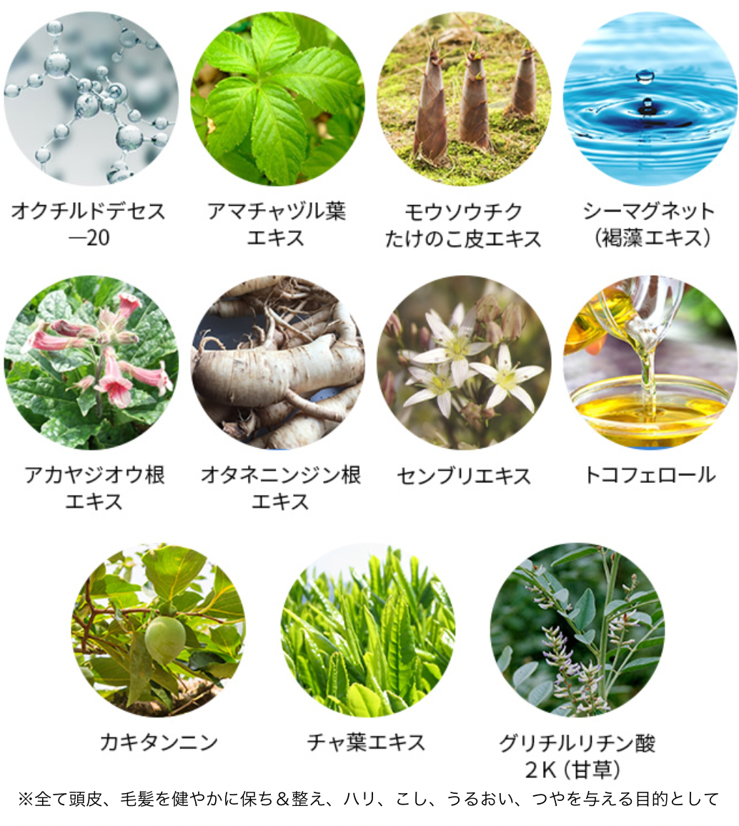 (※⁵アセチルチロシン、ラリックスエウロパエア木エキス、グリシン、チャ葉エキス、塩化亜鉛、ピロ亜硫酸Na:配合目的は、頭皮、毛髪を健やかに保ち&整え、ハリ、こし、うるおい、つやを与えます)