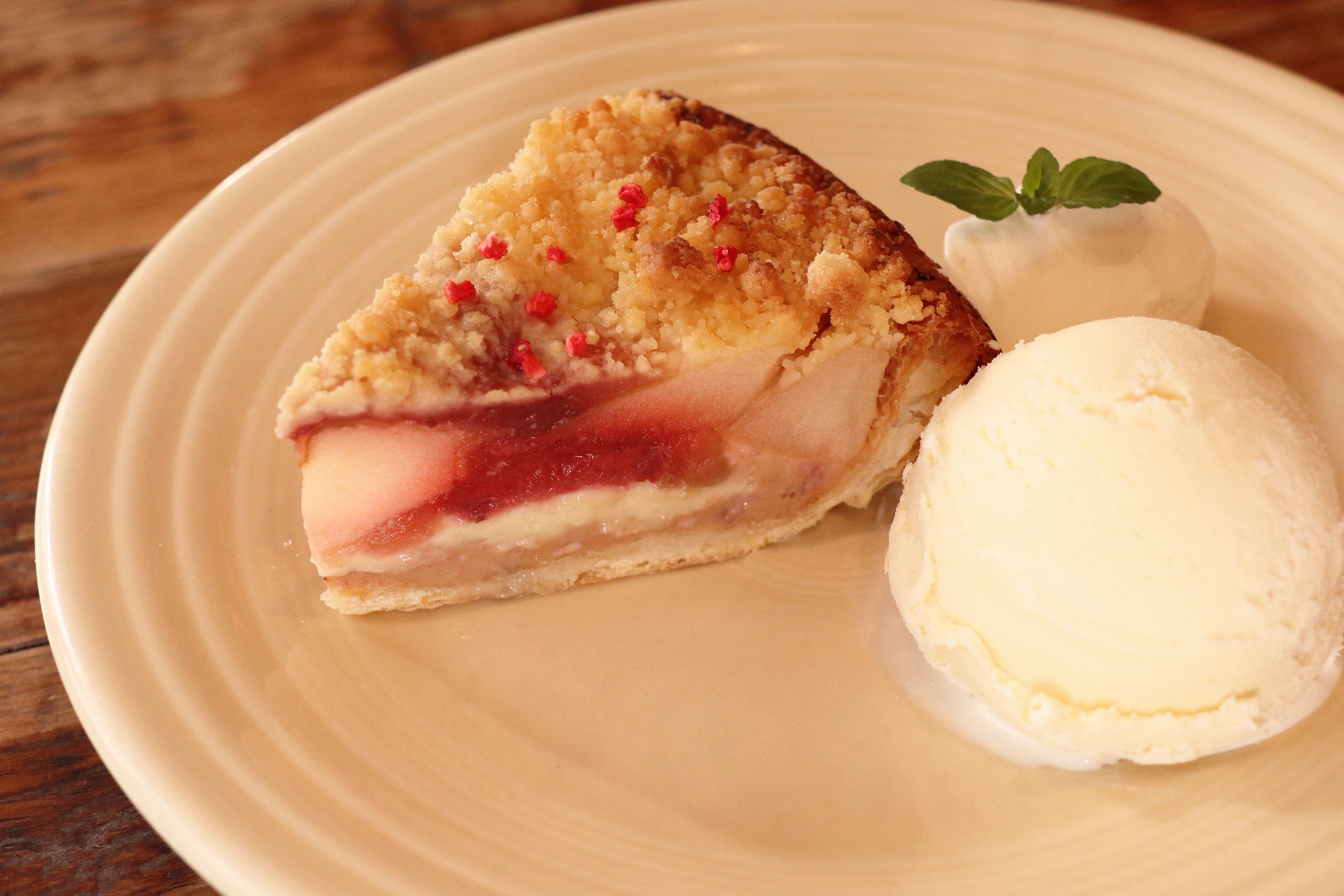 アップルパイに使用されているのは、レシピに合わせて厳選した、程よい酸味が特徴の青森県産紅玉りんご。紅玉りんごのジューシーで爽やかな風味に、苺の甘酸っぱさとホワイトチョコレートの優しい甘さが重なる、上品で春らしい味わいに。仕上げにクッキー生地のクランブルとフリーズドライの苺を添えて、サクサクの食感と苺の香りをプラスしています。一口頬張ればその瞬間から、バターの香り、りんごのジューシーさ、甘酸っぱい苺の春の風味、果物の甘さに優しく寄り添うミルキーなホワイトチョコレート、さまざまな味がバランス良く交差する、今の季節にしか味わえないメニューです。