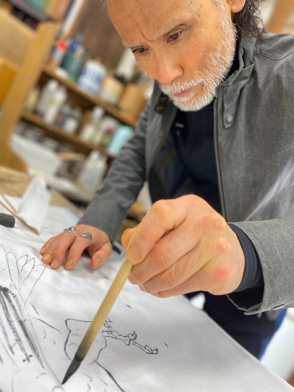 常に新しいことに挑戦し創造の可能性を広げる片岡鶴太郎氏。今まで着物や帯の制作経験はありますが、今回、初挑戦したのが羽織の裏地である「額裏」です。