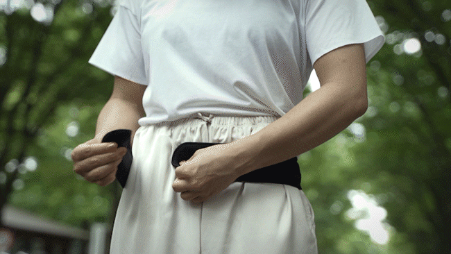 収縮率の異なる二重のベルトを採用することで、強力かつ柔軟なサポート性能を実現。背中の中央から腰骨を通り、腹部まで均一に圧をかけて体感を安定させる内蔵ベルト構造は特許取得済みの独自のサポート方法です。