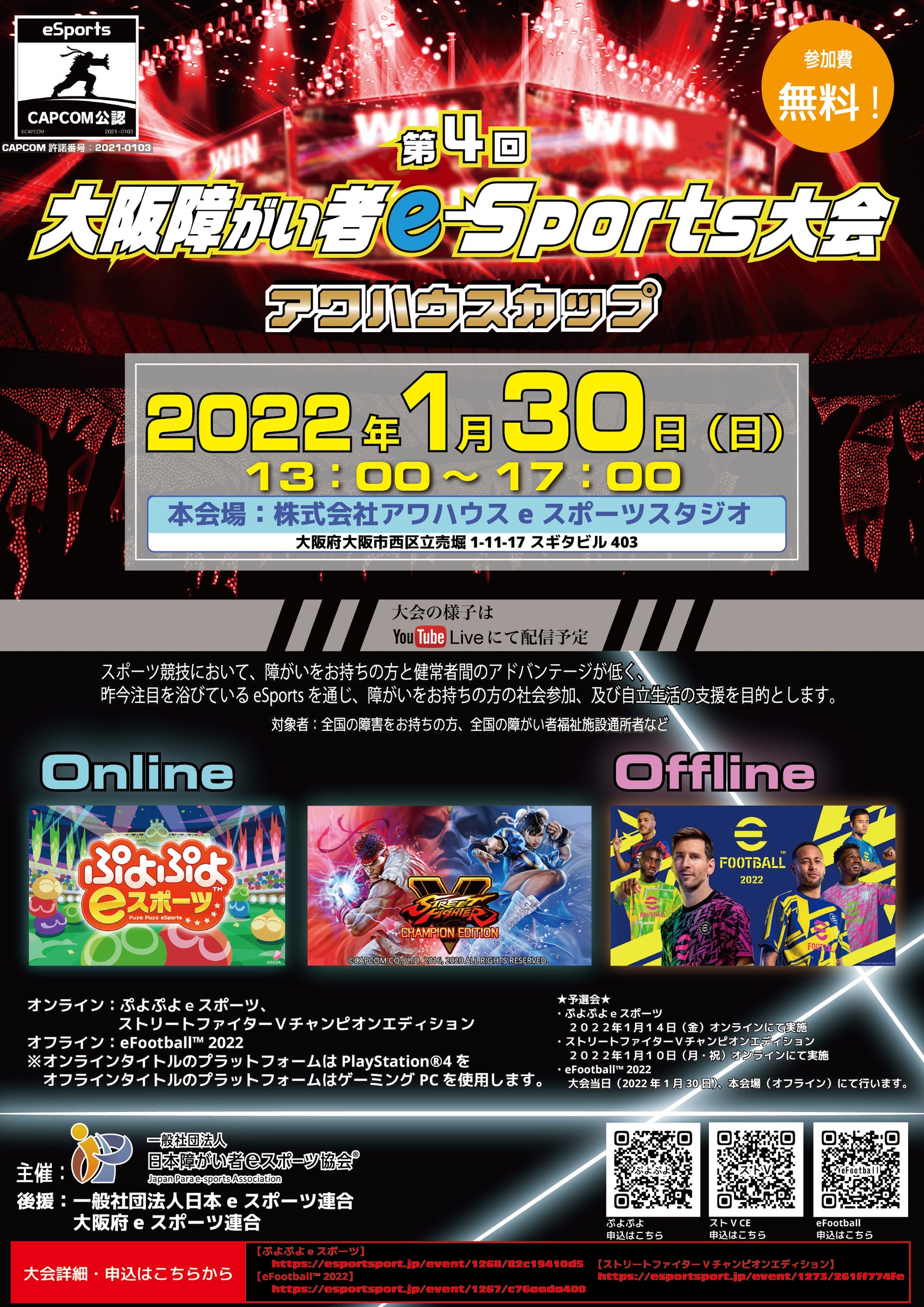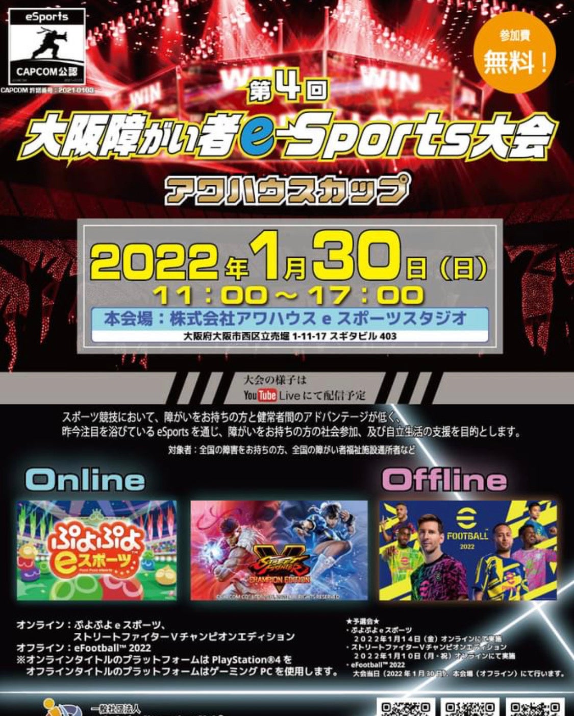 早くも第4回目を迎えた大阪障がい者eスポーツ大会、2022年1月30日(日)13:00~17:00 ぷよぷよeスポーツ、ストリートファイターVチャンピョンエディション等の熱戦がオンラインで繰り広げられます。