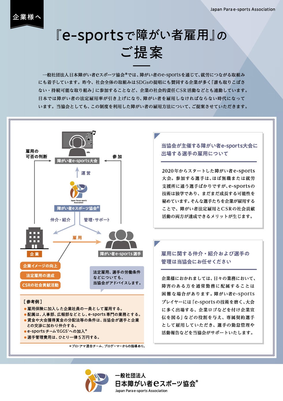 そこで障がいをお持ちのeスポーツプレーヤーを雇用することで、法定雇用率を満たし、さらにeスポーツに真剣に取り組んでいる障がい者に安心して大会に出場し活躍できる場を提供することができます。