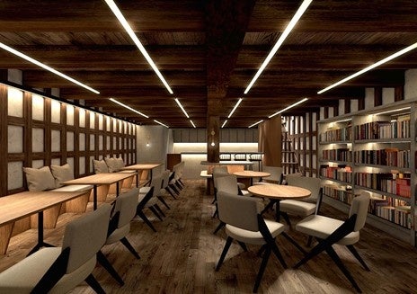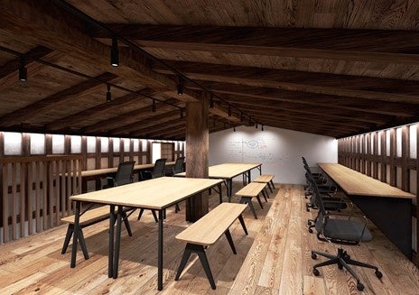 拠点2 階:ワークスペース&セミナー会場機能。 拠点外観:300 年以上続く酒蔵を改装した拠点